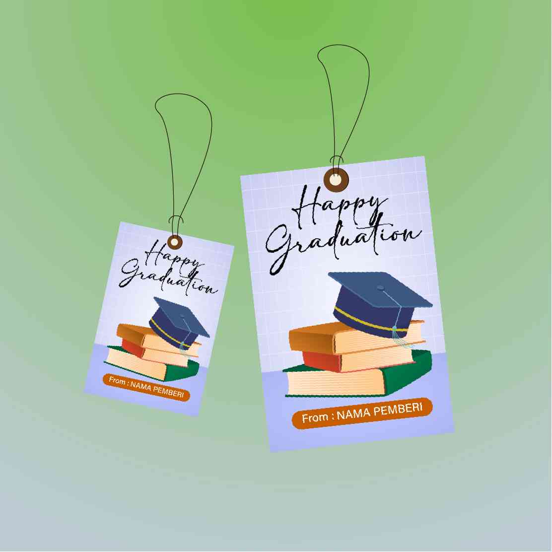 Hangtag bertema kelulusan ini menampilkan tumpukan buku yang dihiasi dengan topi toga berwarna biru tua sebagai simbol pencapaian akademis. Latar bela...