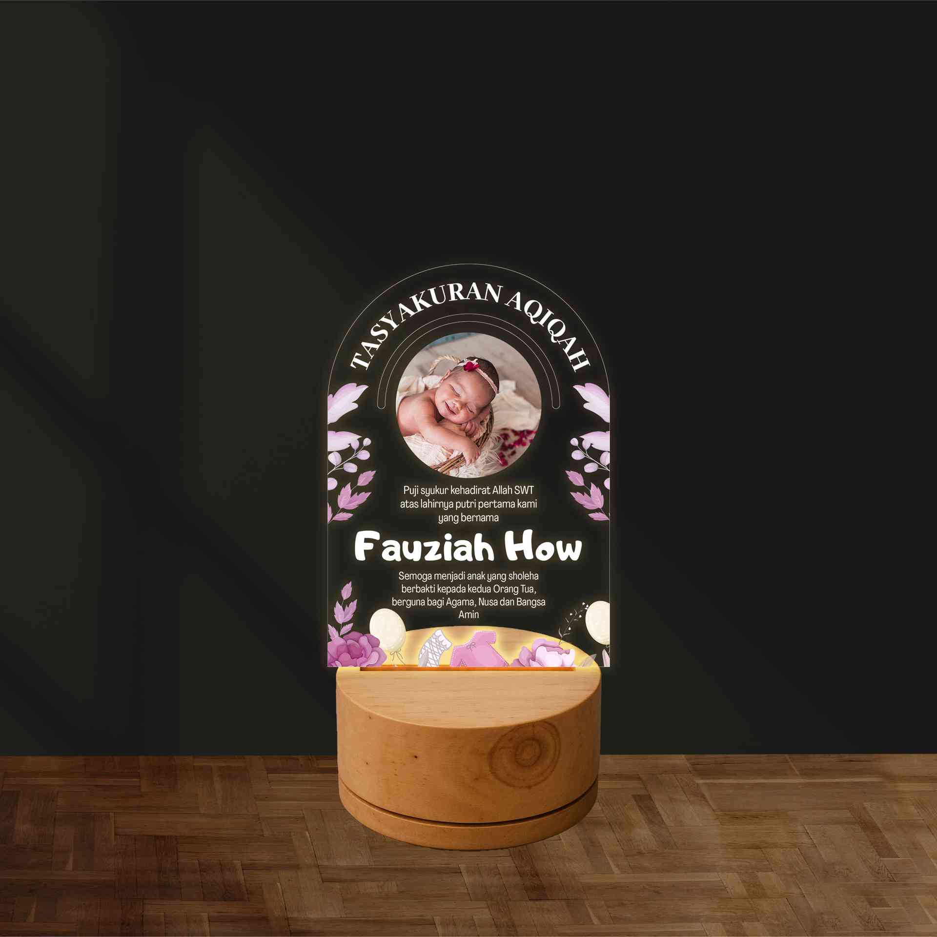 Dream LED Acrylic Akikah Anak Perempuan merupakan plakat LED akrilik berbentuk lengkung vertikal dengan desain personal bertema aqiqah. Didominasi war...