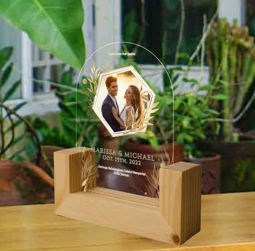 Dream LED ini menggunakan bahan akrilik bening berkualitas tinggi dengan frame kayu natural minimalis, menambah kesan estetik dan premium. Pencahayaan LED lembut akan menonjolkan foto serta tulisan saat dinyalakan, cocok dijadikan pajangan kamar atau ruang tamu maupun hadiah pernikahan personal yang elegan dan berkesan. Semua teks dan foto dapat diubah sesuai permintaan sehingga sangat ideal untuk kado wedding yang memorable.