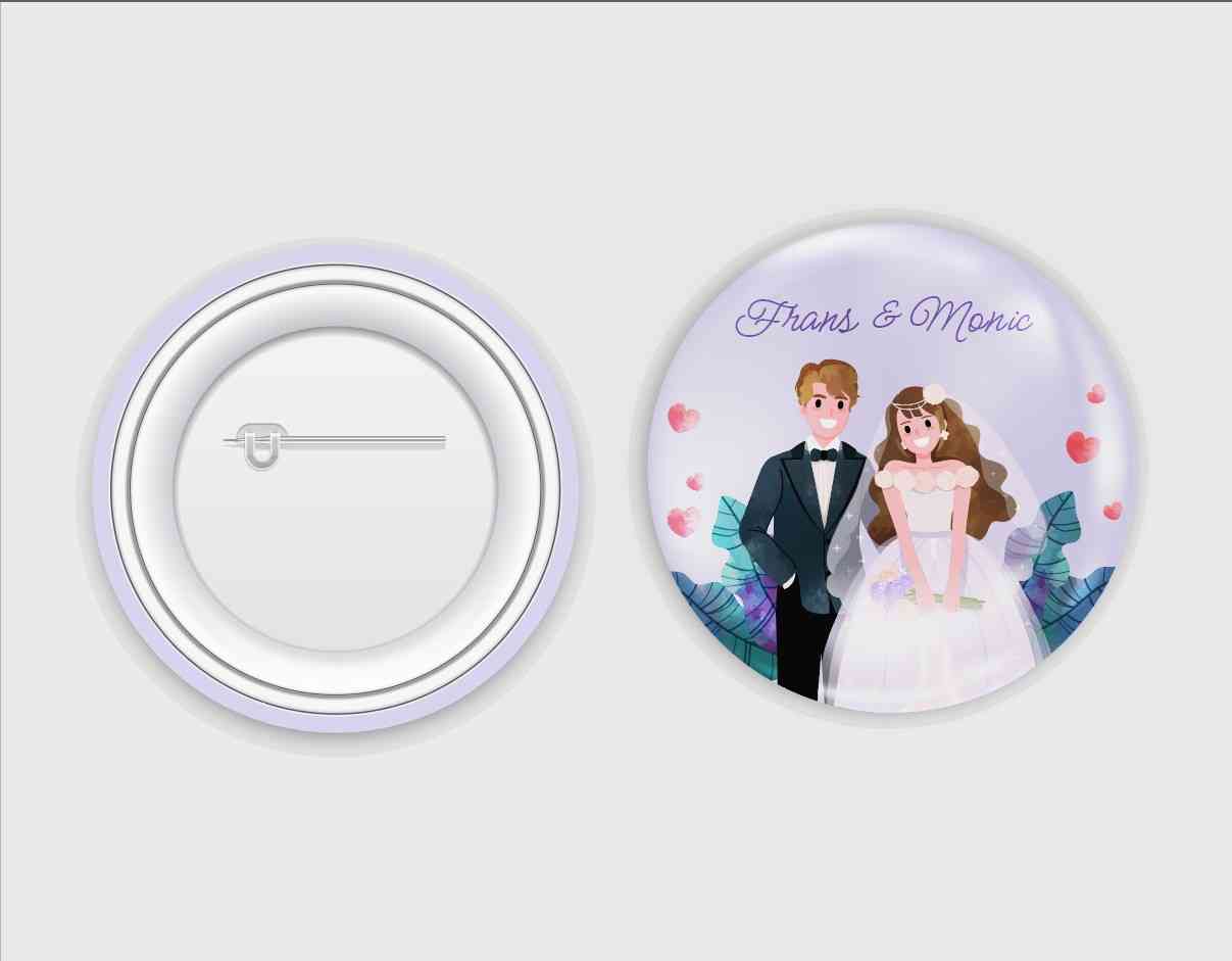 Pin peniti ini menampilkan ilustrasi pasangan pengantin yang ceria dengan latar belakang penuh warna. Desain ini menggambarkan momen bahagia pasangan...