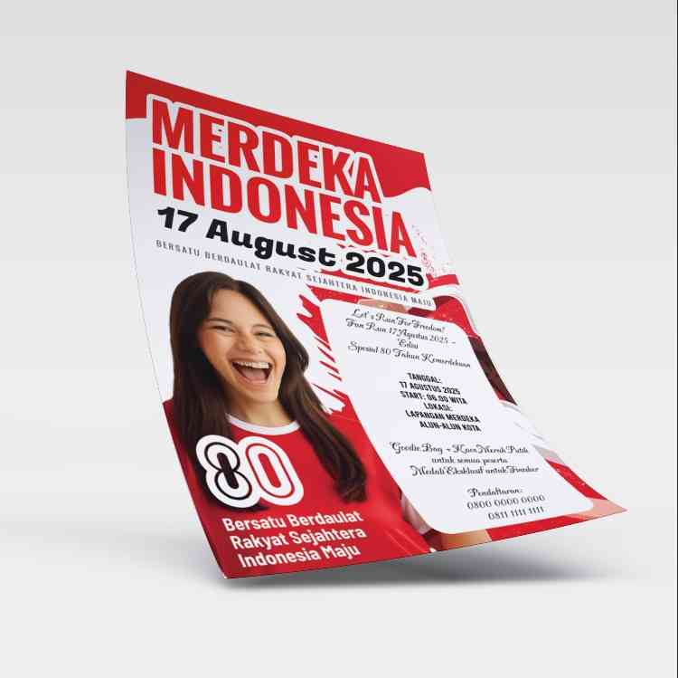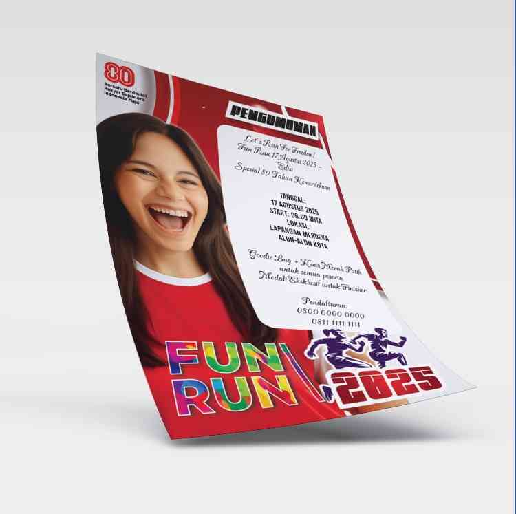 Flyer Fun Run Kemerdekaan berwujud selebaran kertas dengan komposisi visual berwarna merah dan putih yang kuat, mengusung tema semangat kemerdekaan. Desain menonjolkan ilustrasi dua pelari siluet yang energik, dengan tipografi besar bertuliskan “2025 FUN RUN” serta elemen garis dinamis sebagai latar, memberikan kesan aktif dan meriah. Ditujukan sebagai media promosi kegiatan lari sehat bertema nasionalisme, flyer ini relevan untuk komunitas olahraga, event organizer, serta pemerintah daerah, dengan target audiens masyarakat umum yang gemar berolahraga dalam rangka perayaan HUT RI.