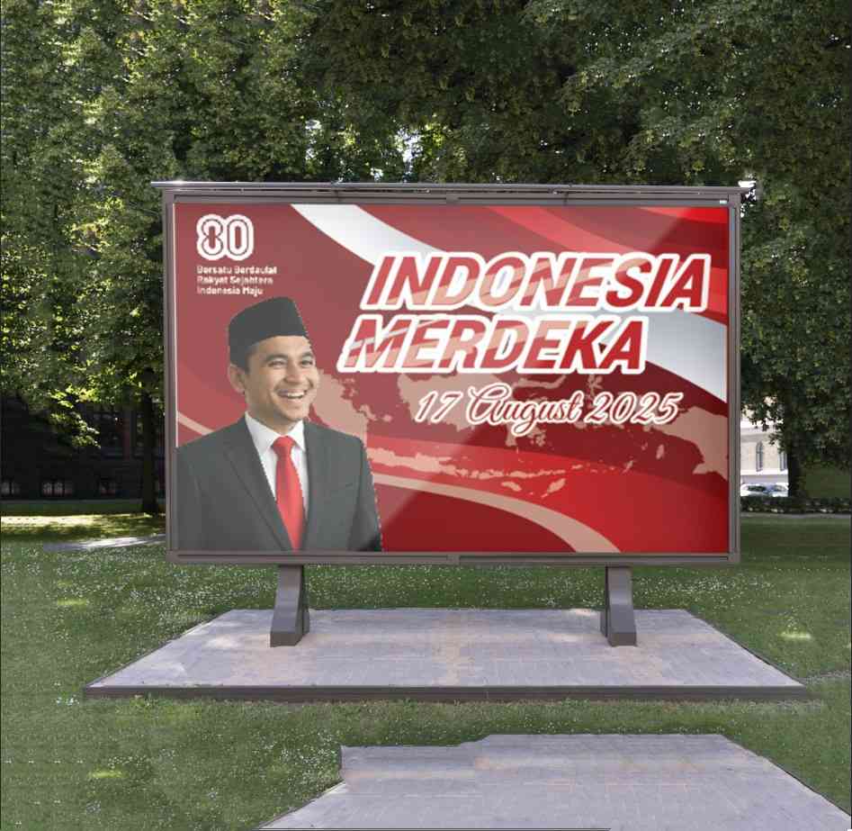 Baliho Kemerdekaan RI 17 Agustus menampilkan format persegi panjang dengan desain visual yang penuh semangat, didominasi warna merah-putih yang melamb...