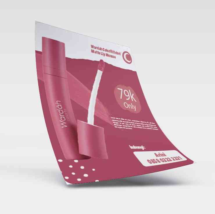 Flyer eksklusif dengan nuansa warna merah muda elegan, menampilkan produk Wardah Colorfit Velvet Matte Lip Mousse yang terkenal dengan hasil akhir lem...