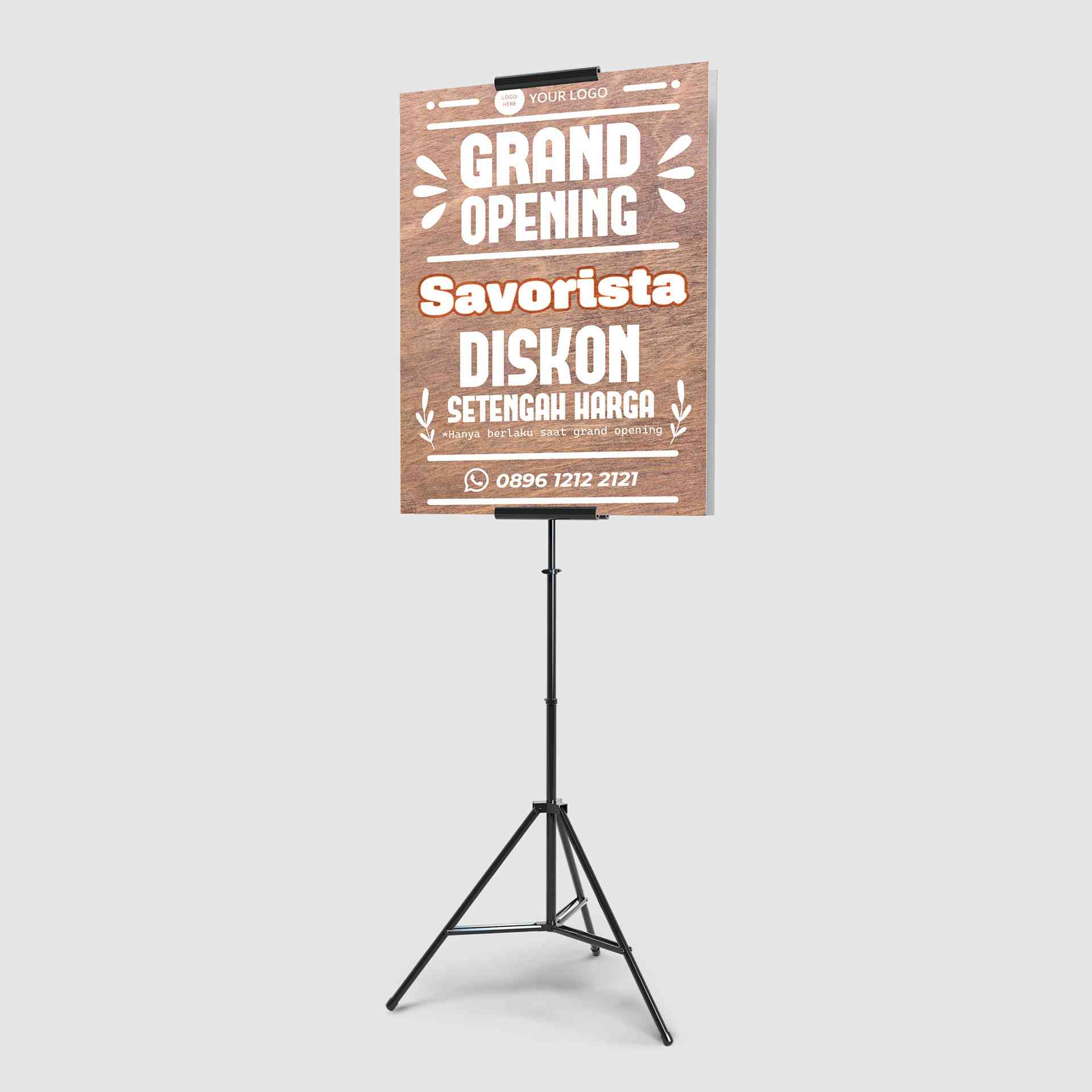 Foamboard ini membungkus suasana hangat khas warkop dalam desain ilustratif yang manis dan familiar. Menggunakan warna coklat susu dengan elemen biji kopi, cangkir, dan foodtruck, desain ini langsung memberikan identitas brand yang kuat. Promo diskon 27% terlihat jelas dan mudah ditangkap mata. Cocok untuk warkop rumahan, bisnis kopi kekinian, atau pop-up stand yang menyasar pelanggan muda dan komunitas lokal. Dengan desain ini, pembukaan usaha ngopi ngopi Anda akan terasa lebih hidup dan memorable.
