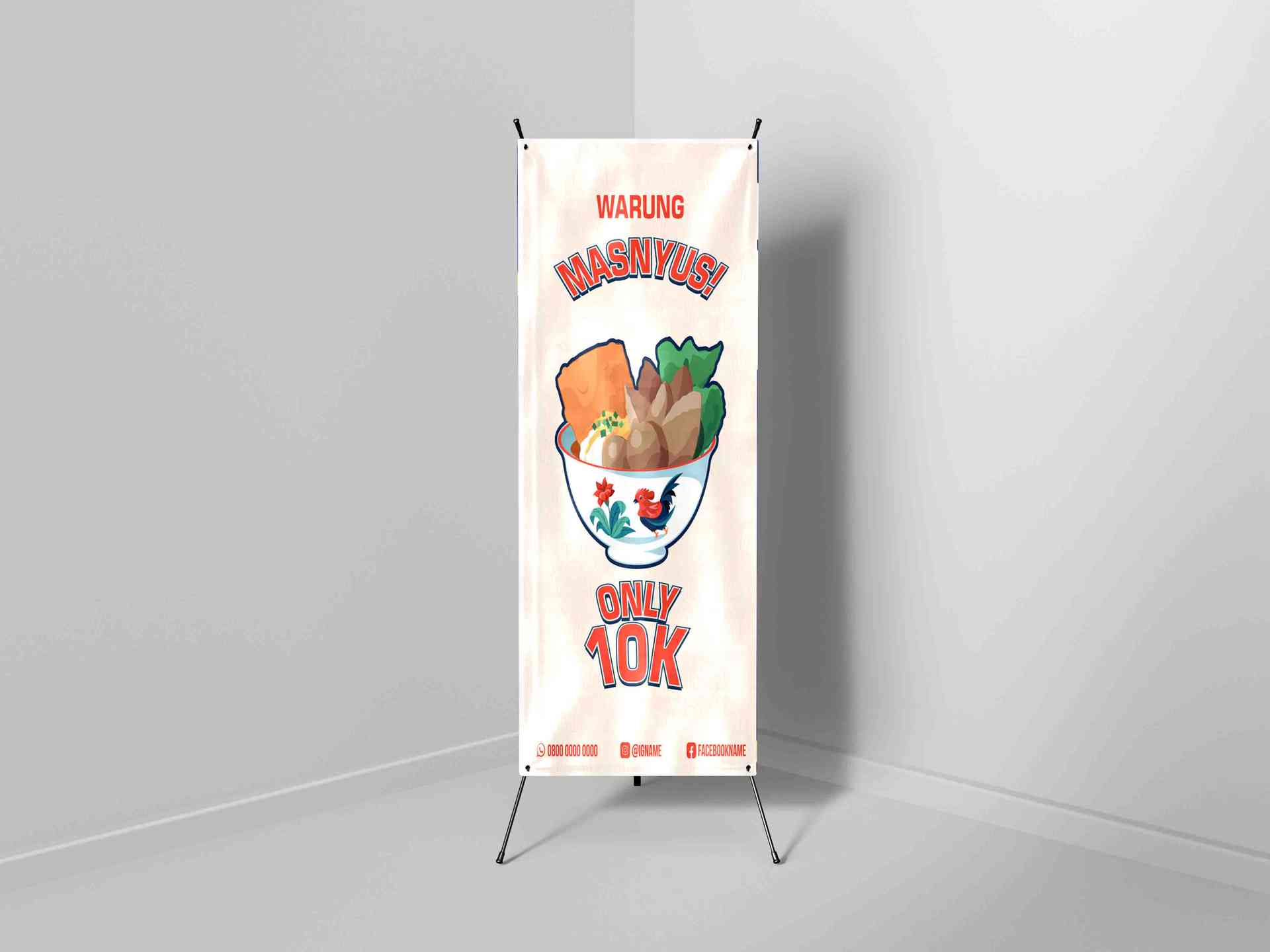 X banner promosi rumah makan baso ini menampilkan desain dominan dengan warna krem, merah, biru, dan aksen hijau pada ilustrasi mangkuk baso lengkap y...