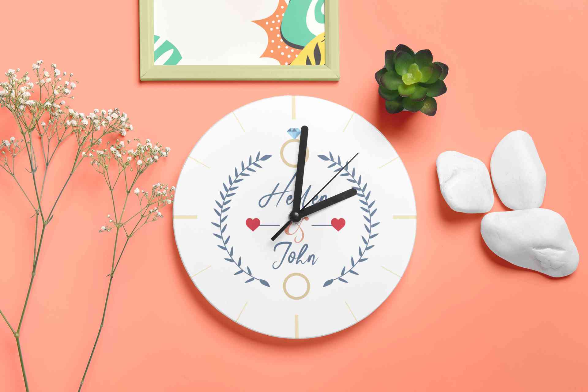 Desain jam dinding ini mengusung konsep romantis bertema pernikahan dengan ilustrasi sepasang pengantin yang elegan. Latar belakangnya bernuansa soft...