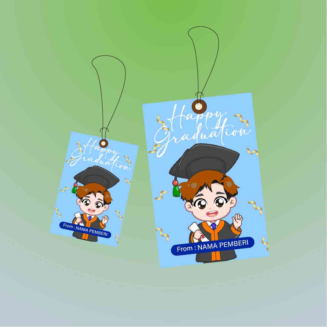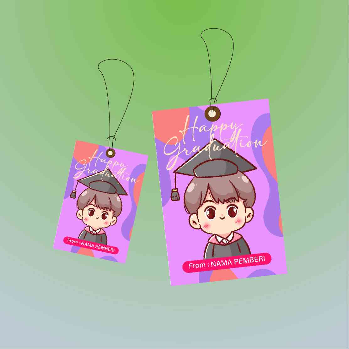 Hangtag ini menampilkan karakter anak laki-laki dengan topi toga dan ekspresi ceria, dilatari gradasi warna pink dan ungu yang playful. Cocok sebagai...