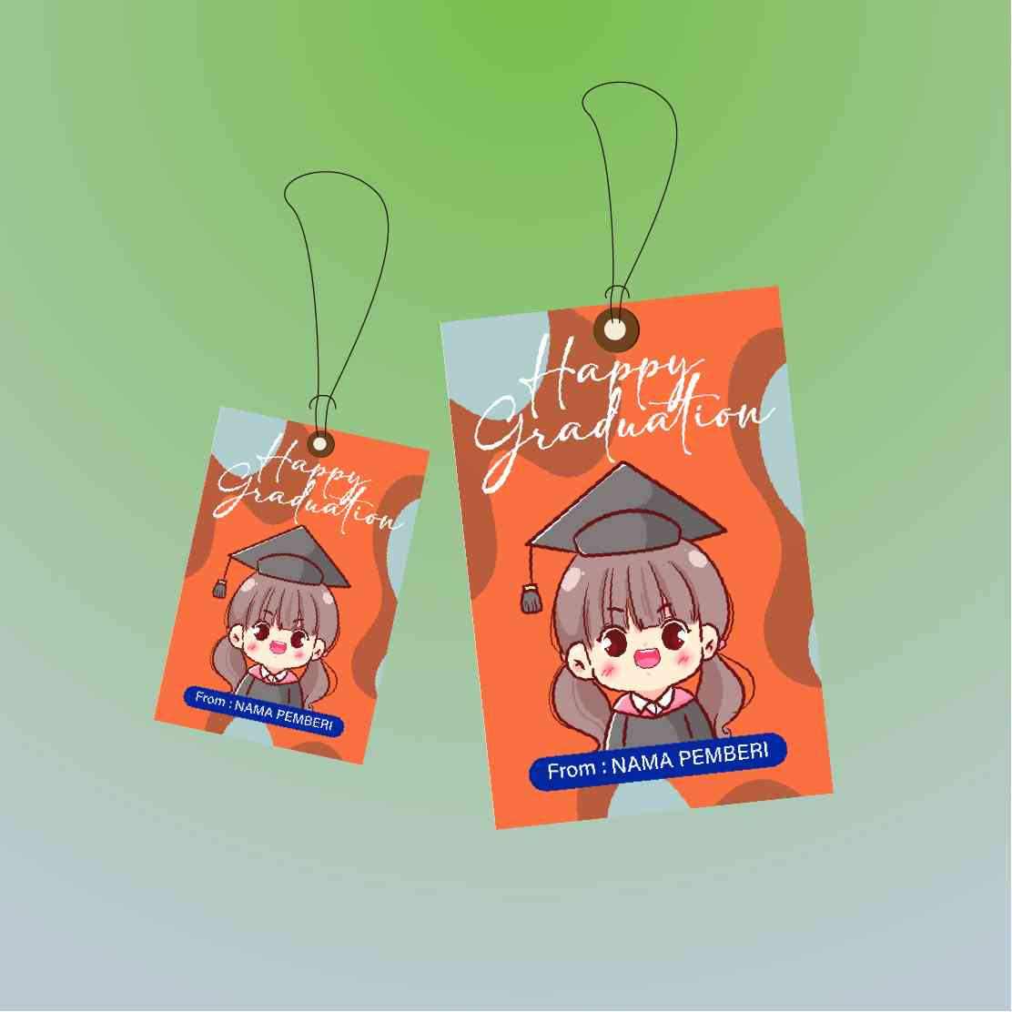 Desain hangtag ini menghadirkan ilustrasi anak perempuan memakai toga dengan ekspresi gembira, berlatar oranye cerah dan biru pastel. Sangat cocok unt...
