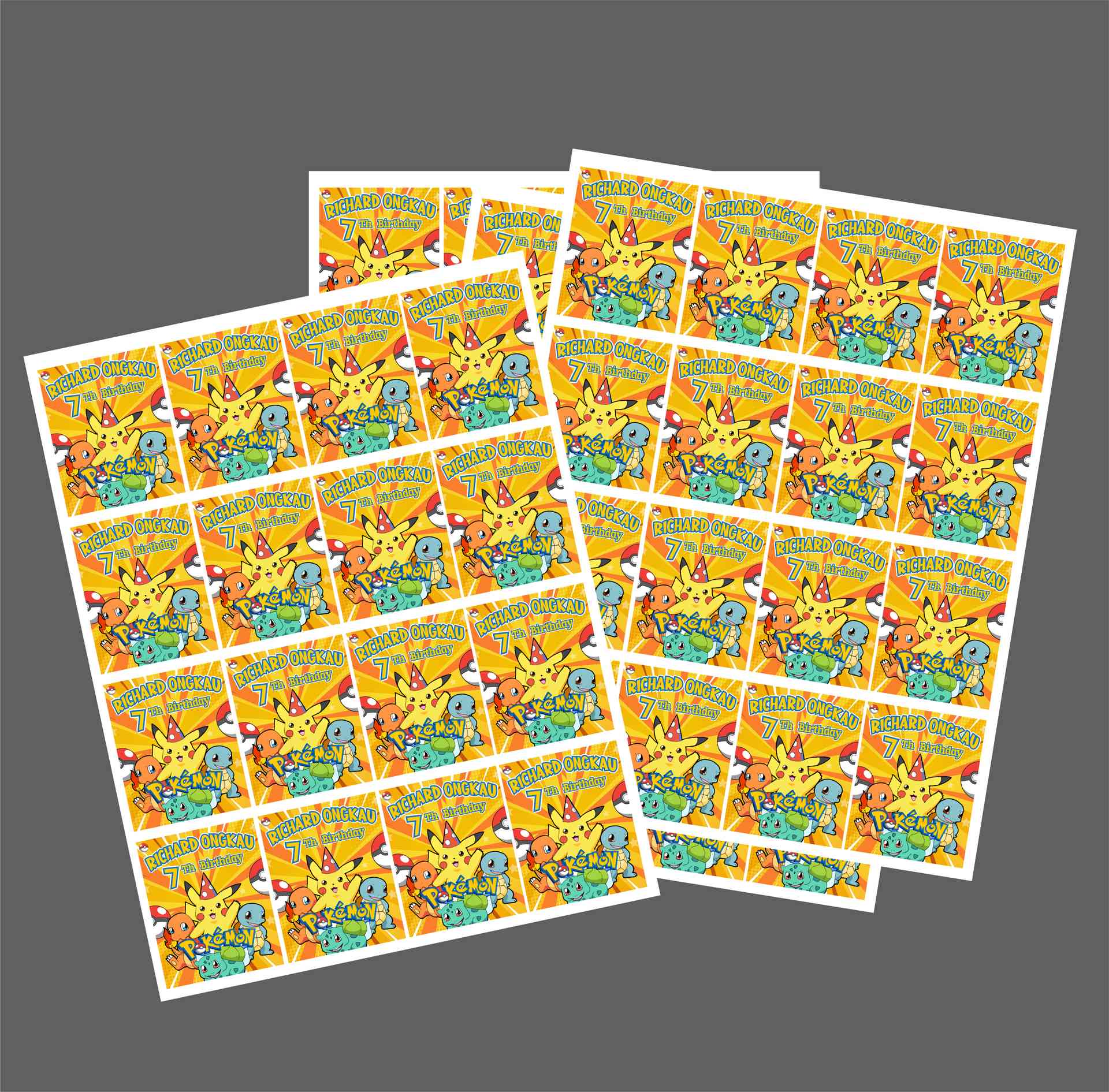 Gambar ini menampilkan beberapa lembar stiker dengan desain bertema Pokémon. Setiap stiker memiliki latar belakang berwarna kuning dengan pola dinamis...