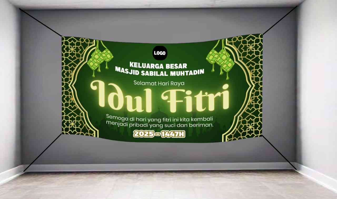 "Selamat Hari Raya Idul Fitri 14xx H"Sampaikan kebahagiaan dan pesan damai di momen Lebaran dengan baliho bertema hijau dengan ketupat dan ornamen Isl...