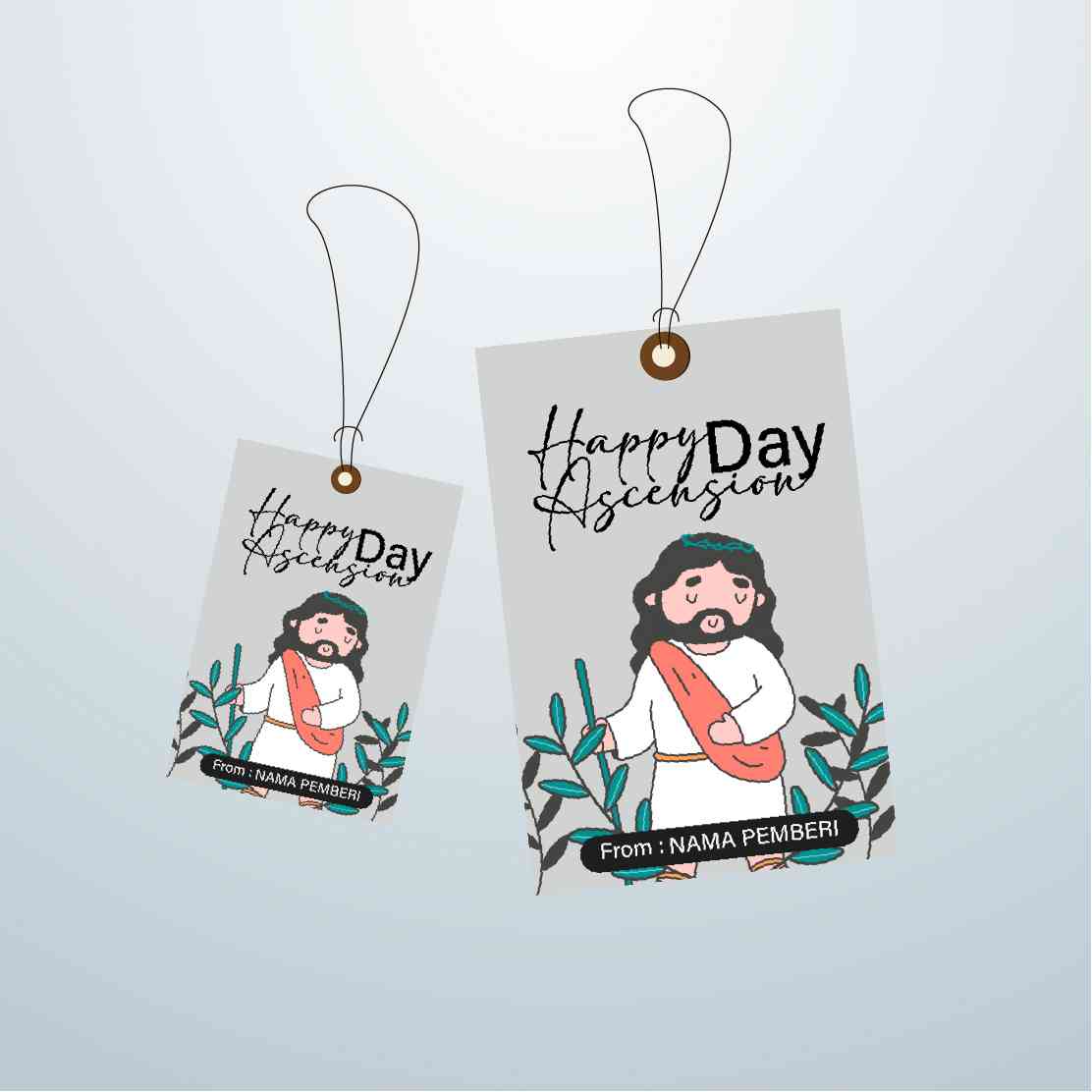 Hangtag dengan latar awan dan salib dominan ini menggambarkan kenaikan ke surga dalam nuansa cerah dan penuh harapan. Ideal untuk acara ibadah atau ha...