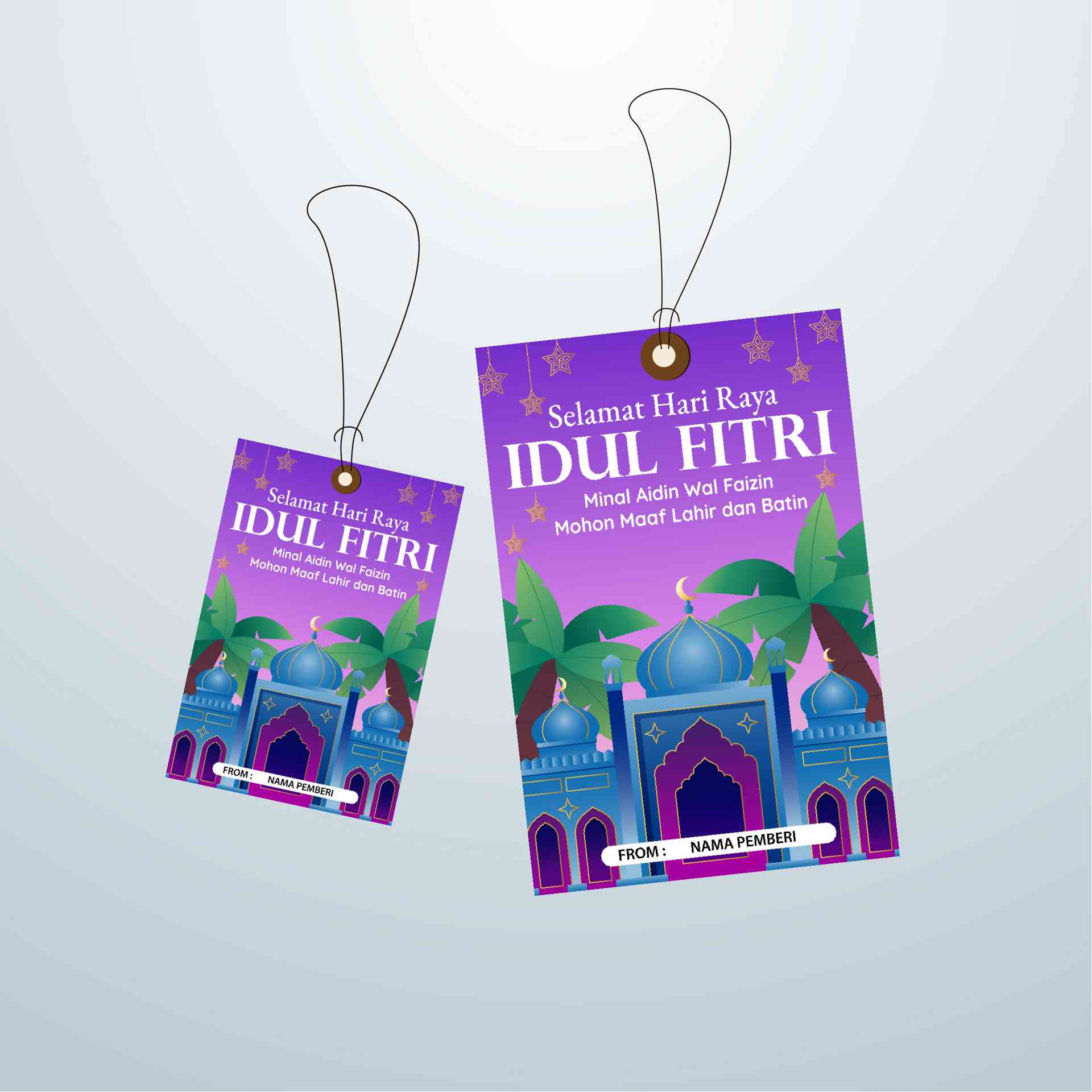 Desain tag ucapan Selamat Hari Raya Idul Fitri dengan ilustrasi masjid berwarna biru dan ungu, dikelilingi pohon kelapa, bintang, dan bulan sabit. Lat...