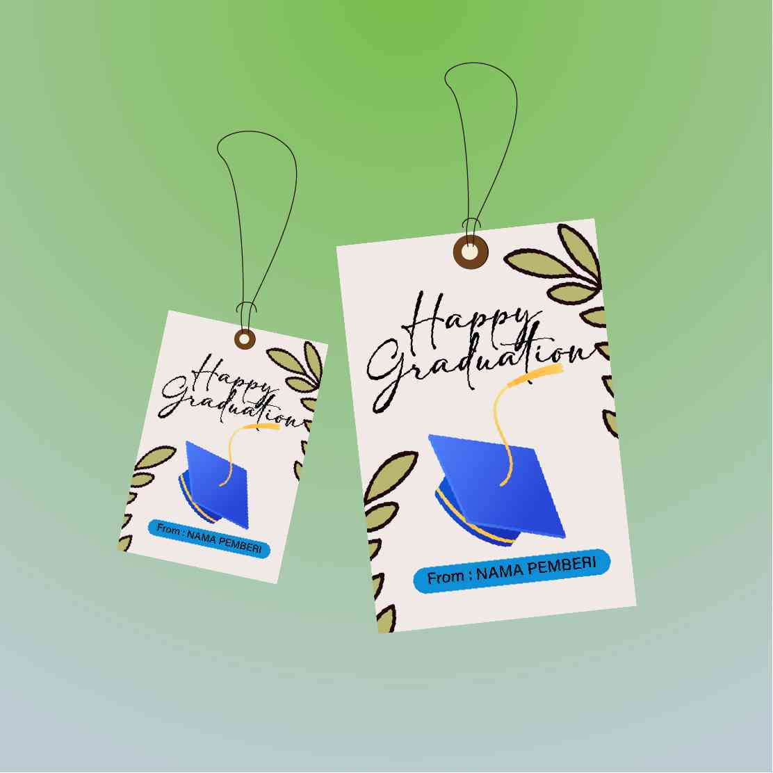 Hangtag simpel namun tetap elegan ini menampilkan ilustrasi topi toga biru dengan hiasan daun di sudut, cocok untuk kamu yang menyukai desain bersih d...