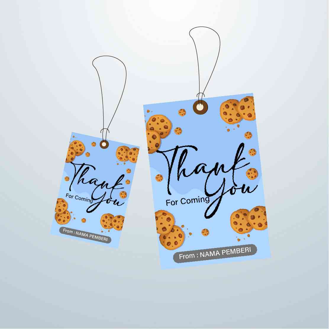 Hangtag ini menampilkan cookie-chip yang tersebar di seluruh desain dengan latar biru muda. Memberikan kesan manis, menyenangkan, dan cocok untuk bake...