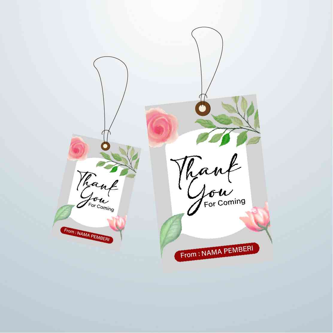 Hangtag ini didesain dengan latar abu-abu muda yang memberikan kesan netral dan elegan, dihiasi ilustrasi bunga mawar pink serta dedaunan hijau yang m...