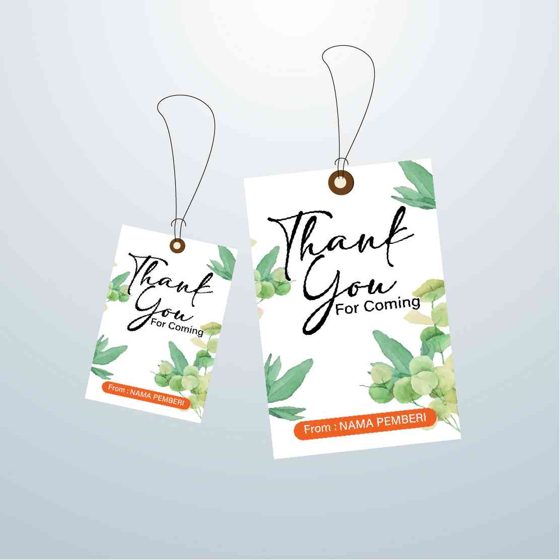 Dengan dominasi warna putih dan elemen daun berwarna hijau lembut, hangtag ini menciptakan nuansa bersih, alami, dan tenang. Tulisan "Thank You For Co...