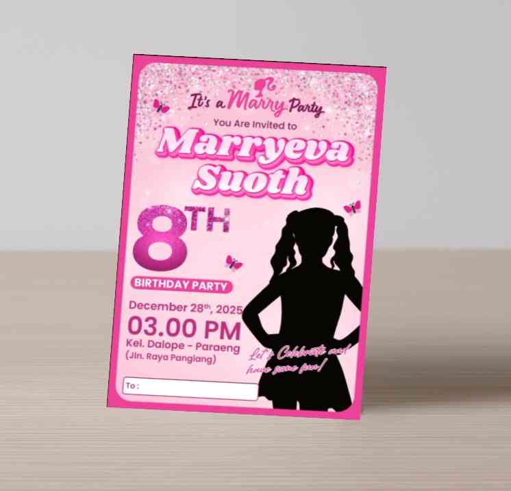 Undangan ulang tahun ini didesain dengan tema Barbie yang feminin dan penuh glamor, menampilkan latar belakang pink glitter yang memancarkan kesan mew...