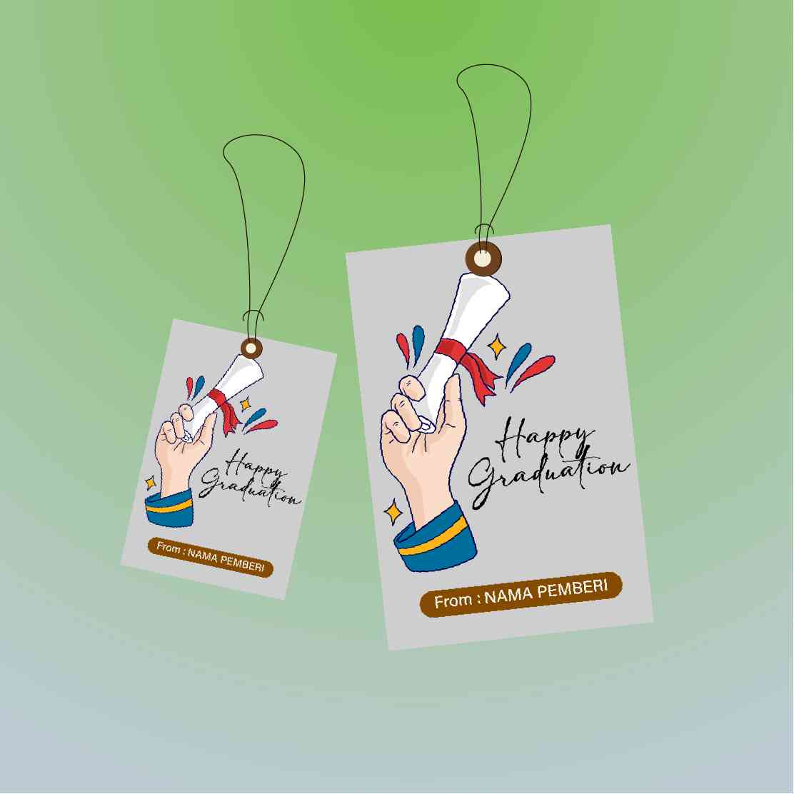 Hangtag ini menampilkan topi toga yang diletakkan di atas pita merah bertuliskan ‘Graduation’, memberikan kesan formal dan penuh semangat. Warna abu-a...