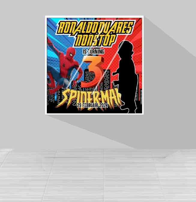 Banner ini berukuran 60x160 cm dengan tema superhero yang dominan, menampilkan ilustrasi Spiderman sebagai elemen utama di bagian tengah atas, seolah...
