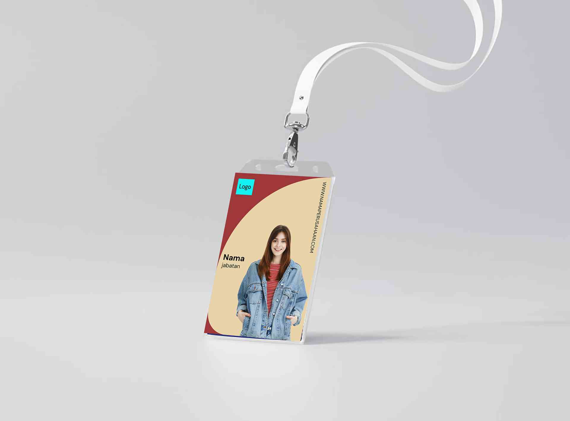 ID Card karyawan berbentuk persegi panjang vertikal dengan desain soft, elegan, dan mengutamakan kombinasi warna maroon dan cream sebagai warna domina...