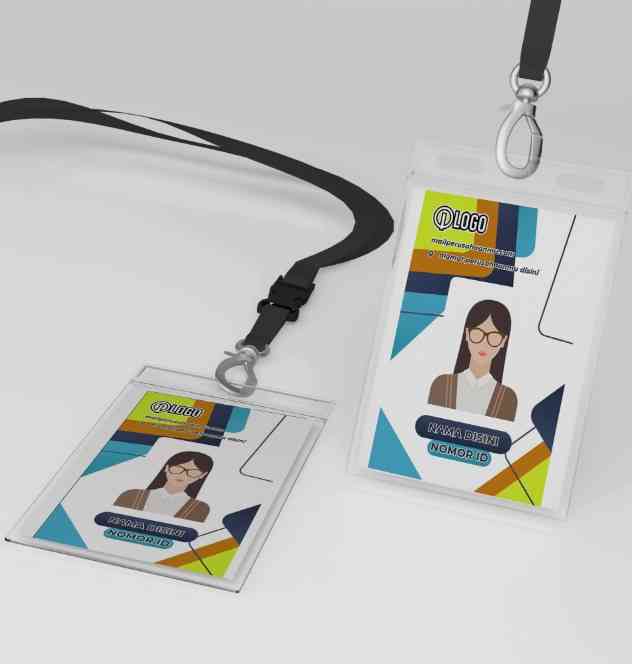 ID card bergaya profesional dengan sentuhan warna pastel seperti biru, oranye, dan putih mendominasi desain visual, memberikan kesan modern dan segar....