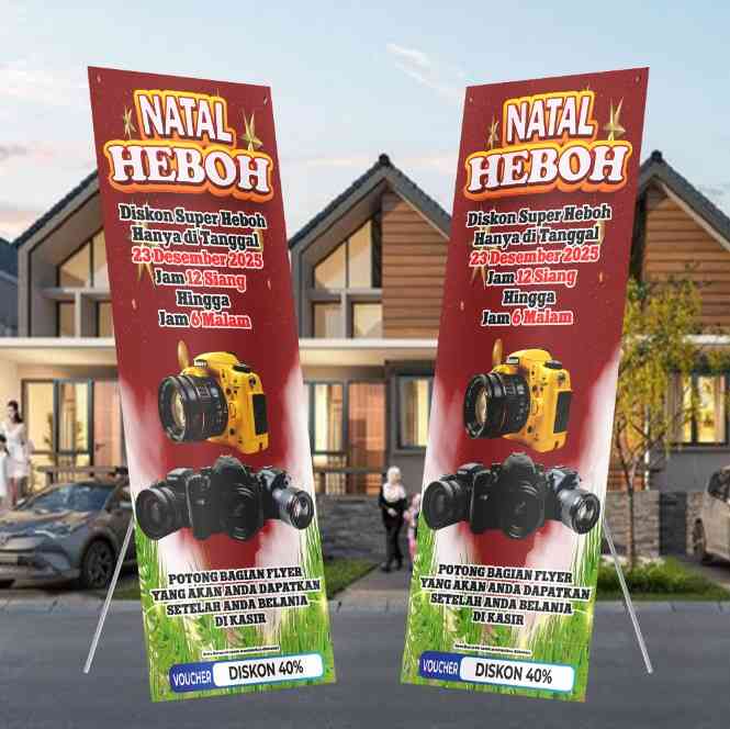 Banner ini adalah standing banner vertikal yang dirancang untuk promosi "Diskon Natal". Desain utamanya memiliki latar belakang berwarna hitam pekat y...