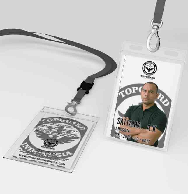 ID Card resmi organisasi nasional top guard berbentuk persegi panjang vertikal dengan dominasi warna hitam dan putih, menampilkan foto anggota berpose...