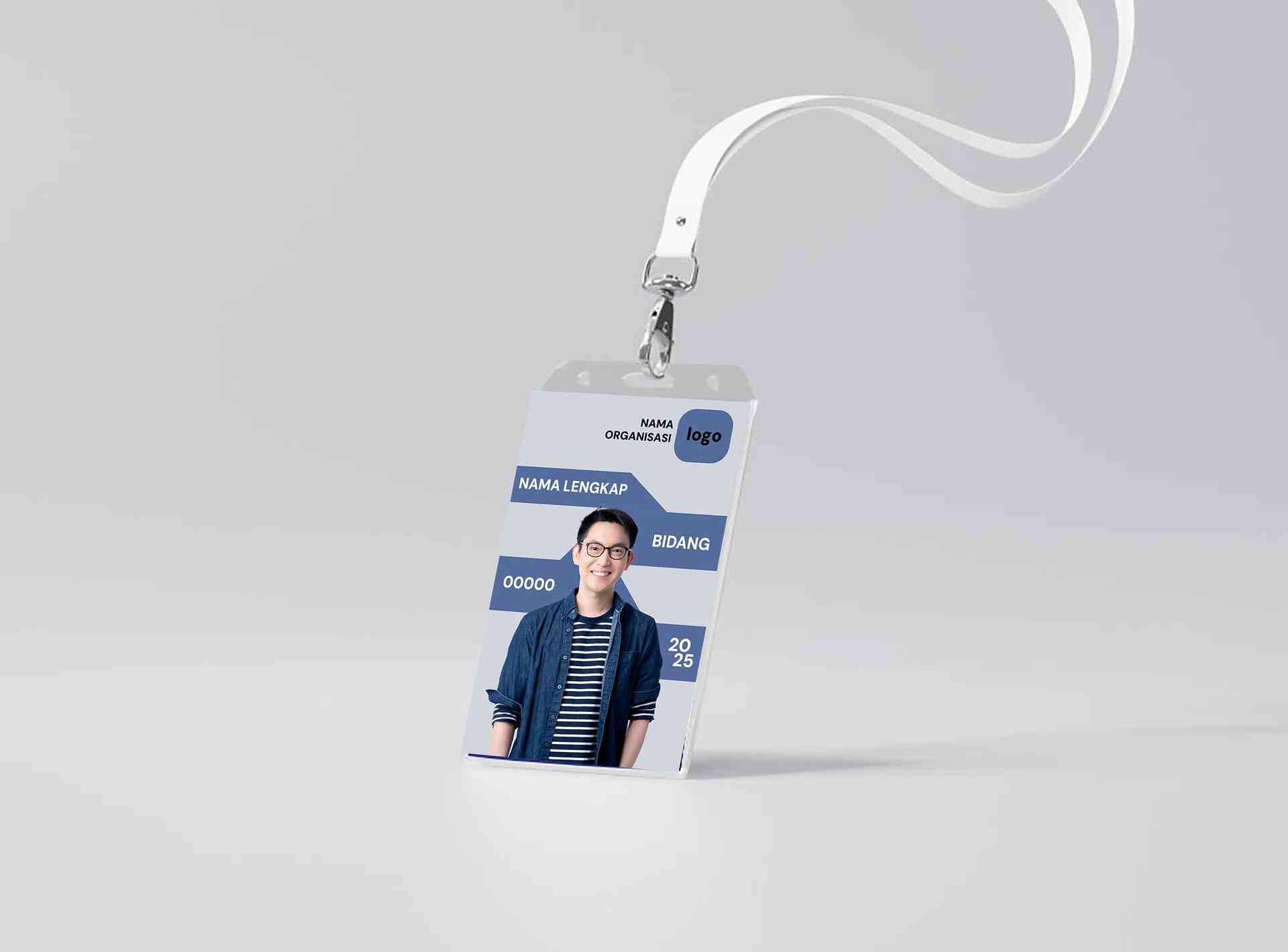 Desain ID card ini menonjolkan kesan modern dengan kombinasi warna biru navy dan abu muda. Di bagian atas terdapat nama organisasi dan logo, disusul n...
