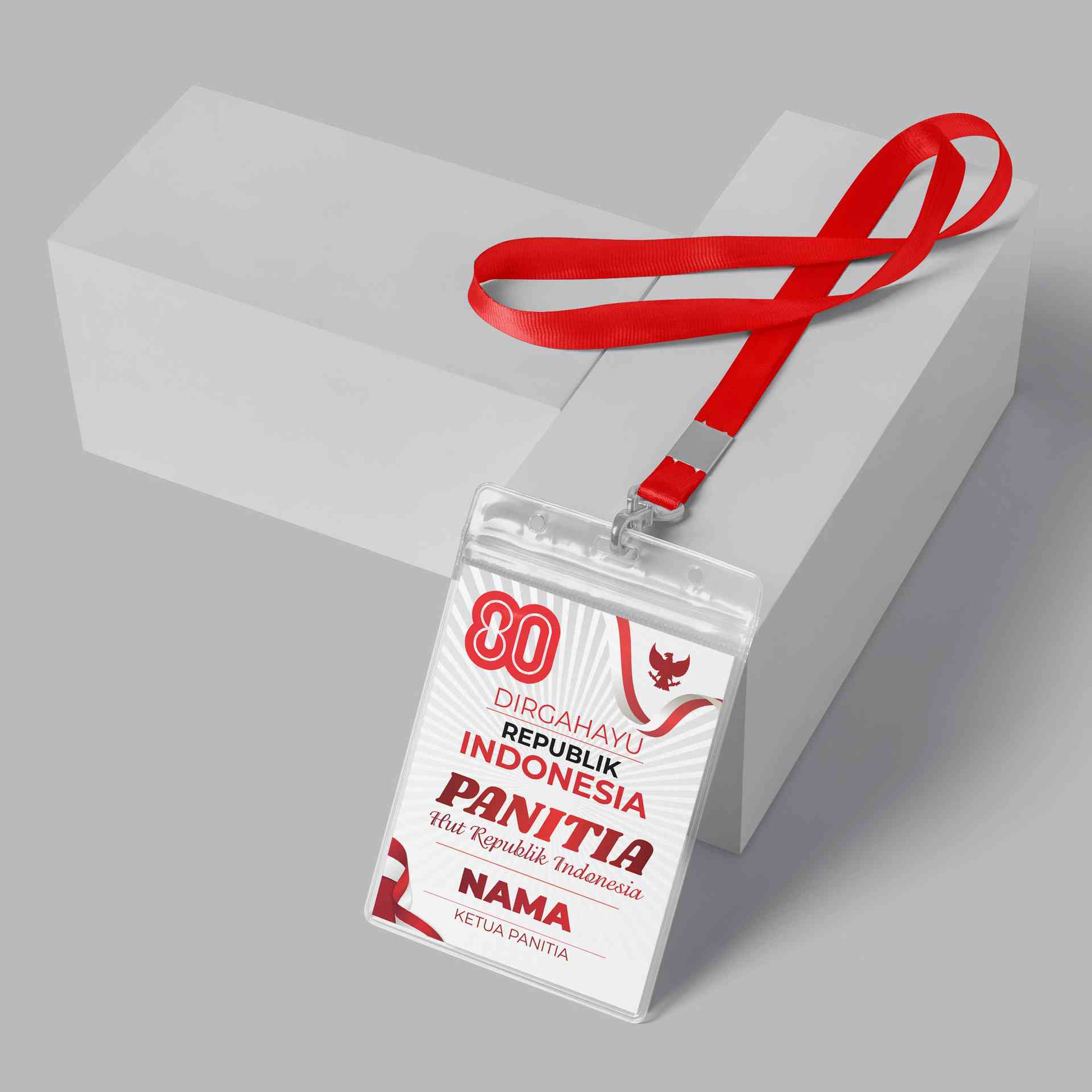 Id Card Panitia Kemerdekaan Merah Putih berbentuk persegi panjang dengan warna dominan merah dan putih, menampilkan desain visual tegas berupa elemen...