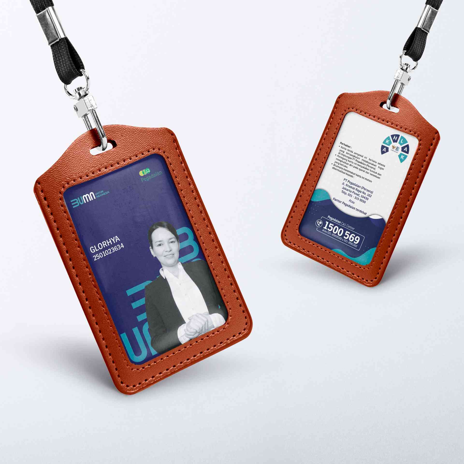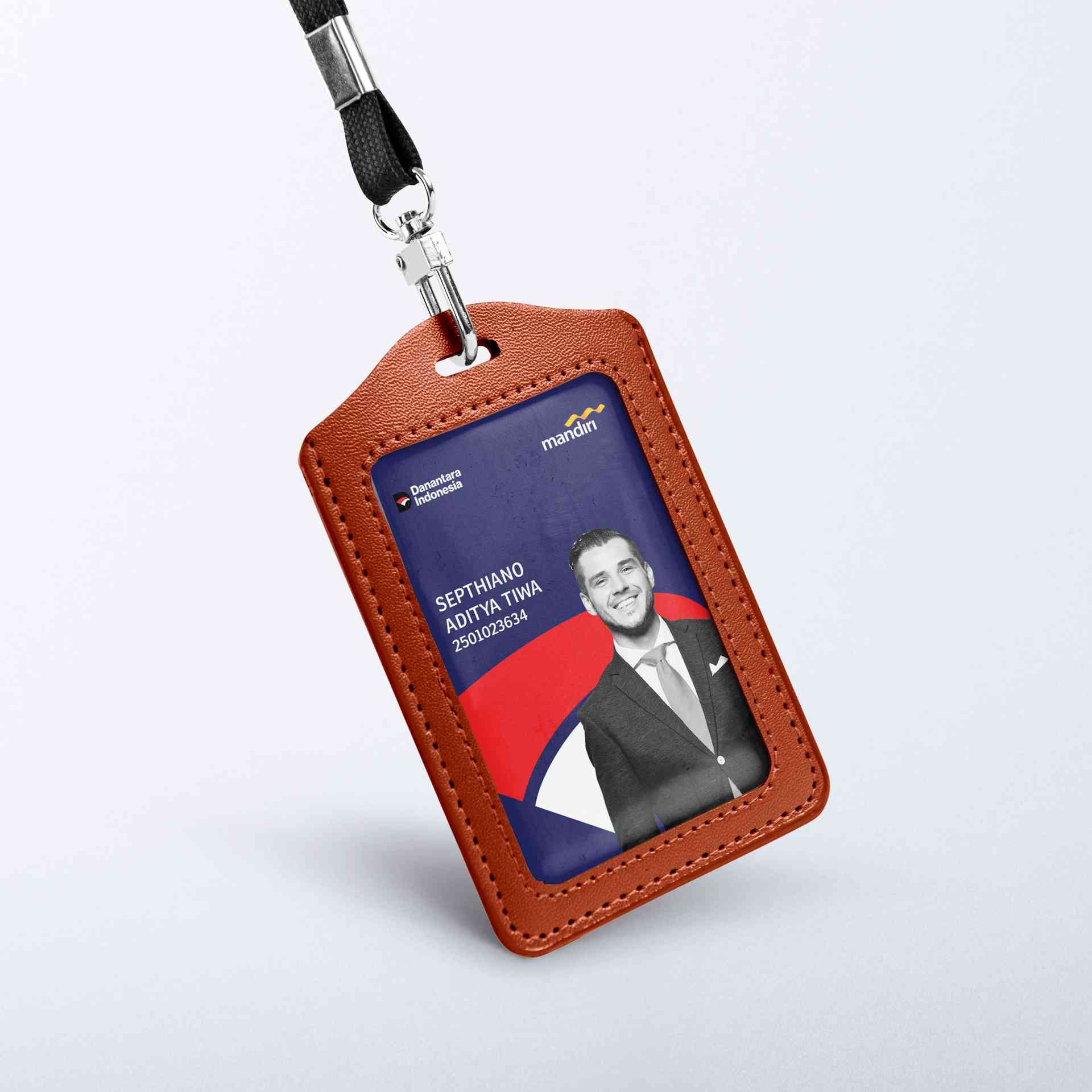 ID Card perusahaan ini berbentuk persegi panjang vertikal dengan dominasi warna biru tua dan merah, menampilkan desain visual modern dengan elemen len...