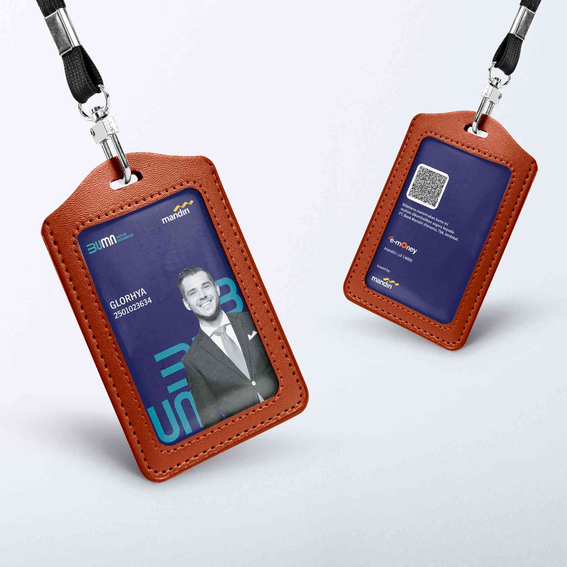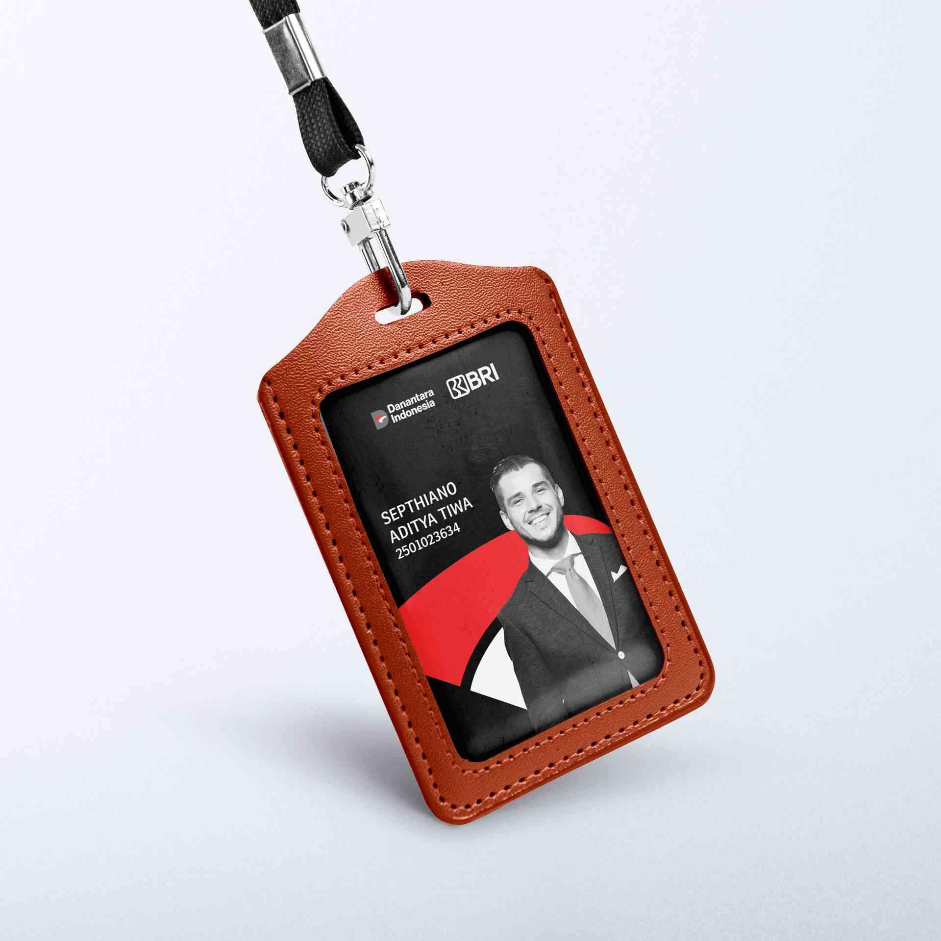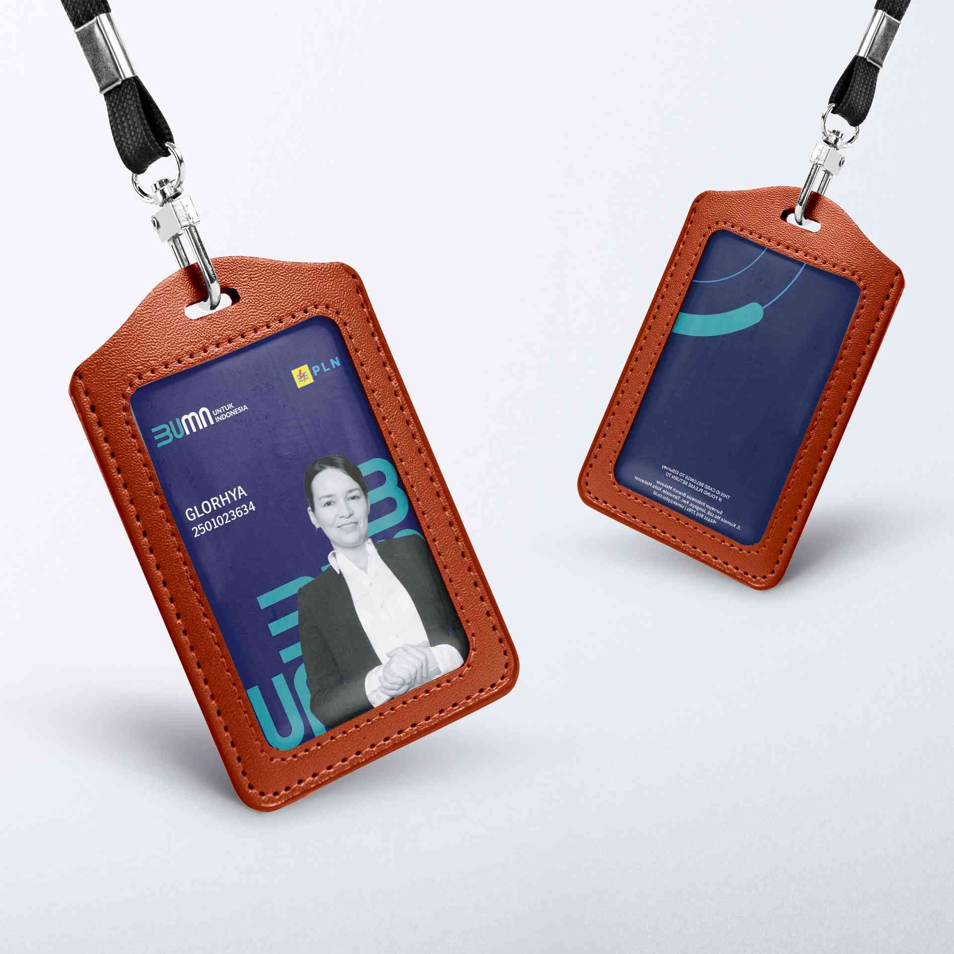 ID Card perusahaan dengan dominasi warna biru tua menampilkan foto dan identitas pemilik secara jelas, disertai elemen visual berupa logo BUMN dan Per...