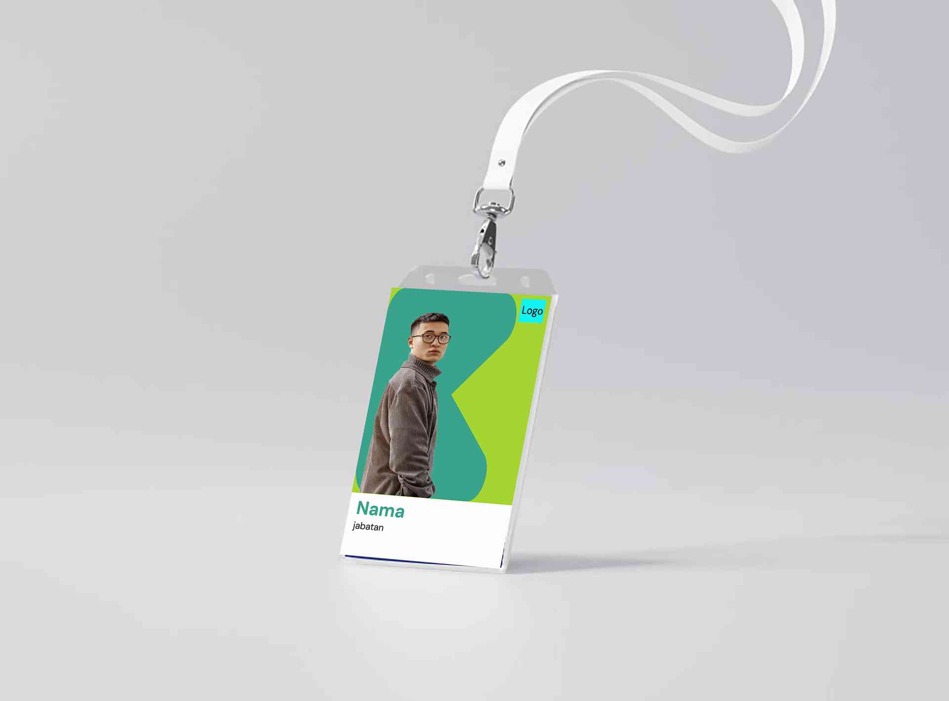 ID card minimalis berbentuk persegi panjang dengan sudut tumpul, mengusung tema modern berdesain simpel menggunakan latar dominan hijau dengan aksen b...