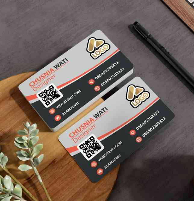 Kartu nama ini memiliki desain modern dengan kombinasi warna abu-abu, hitam, dan merah yang memberikan tampilan profesional dan elegan. Logo ditempatk...