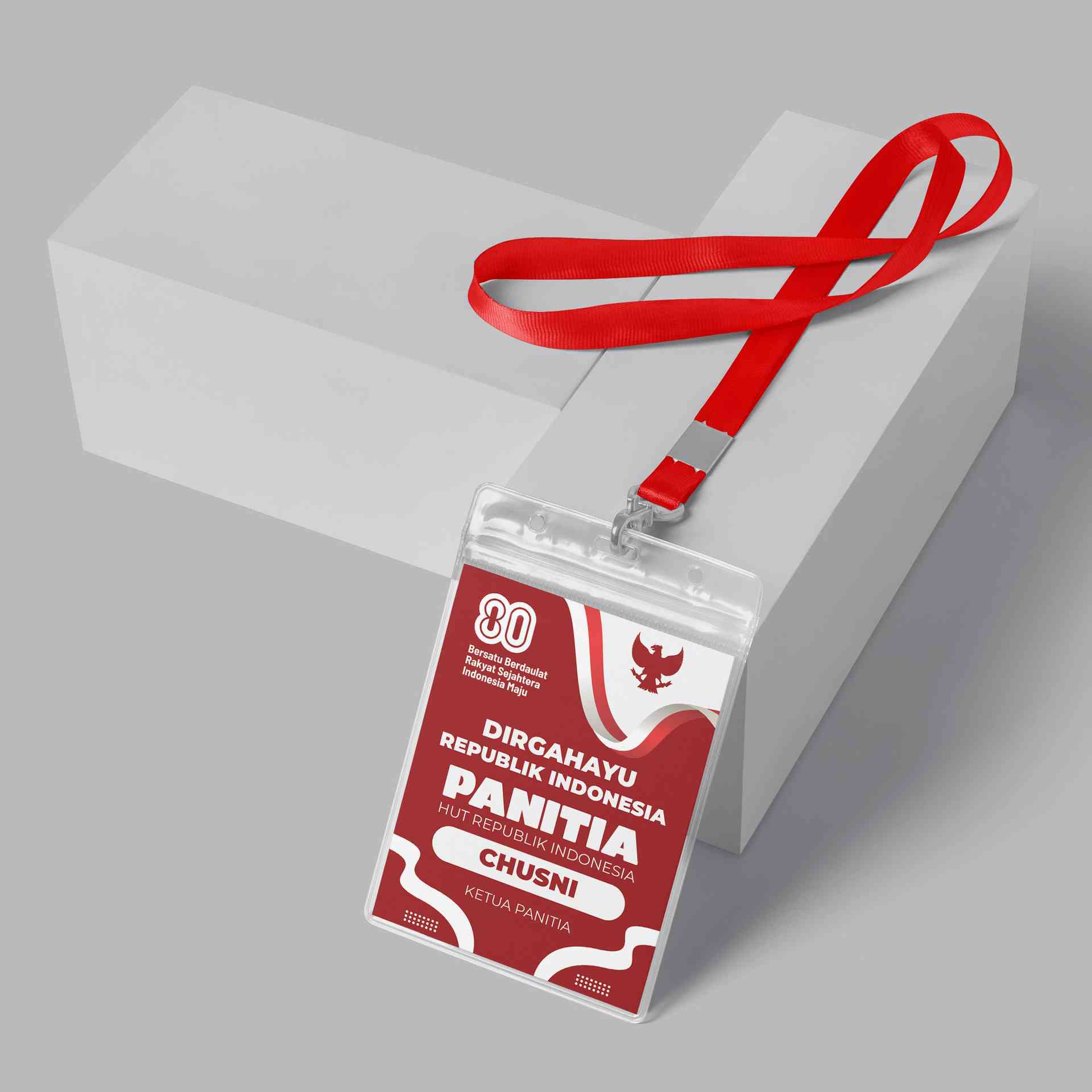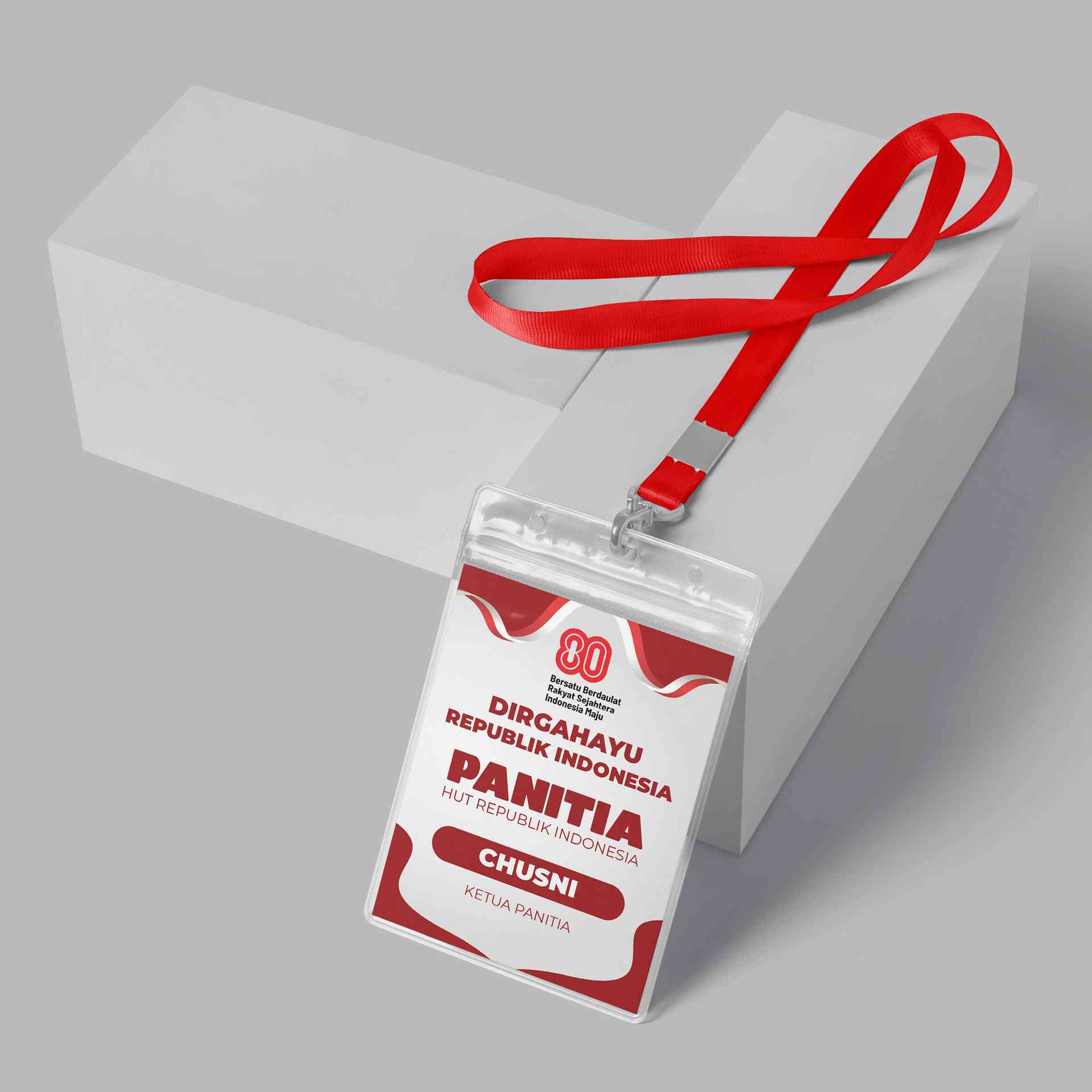 Id Card Panitia Kemerdekaan Merah Putih berbentuk persegi panjang dengan warna dominan merah dan putih, menampilkan desain visual tegas berupa elemen...
