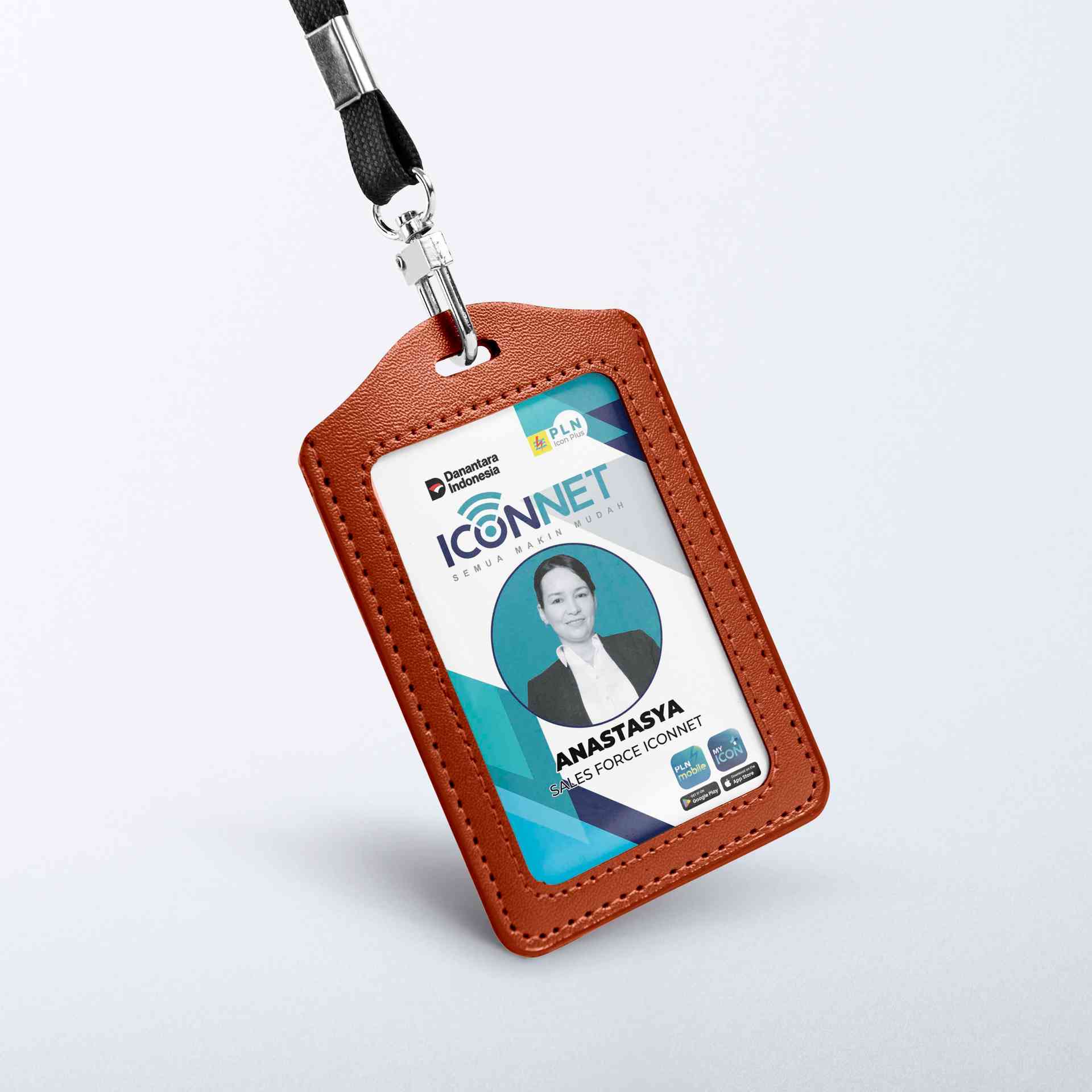 ID Card perusahaan ini berbentuk persegi panjang dengan latar putih dan aksen merah mencolok di bagian bawah desain, menampilkan foto hitam putih kary...