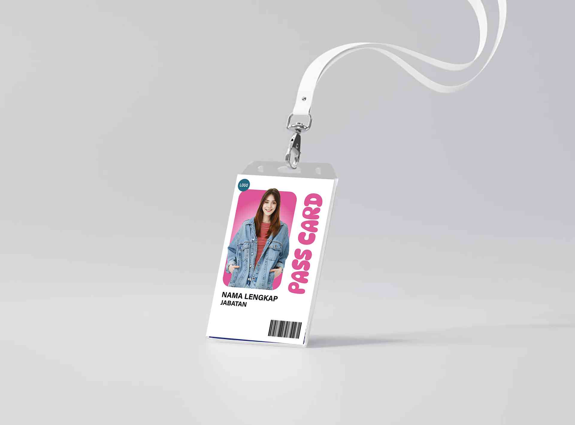 ID Card perusahaan bertema latar putih dengan hiasan hijau muda ini berbentuk persegi panjang vertikal dan menampilkan foto pegawai dalam lingkaran di...