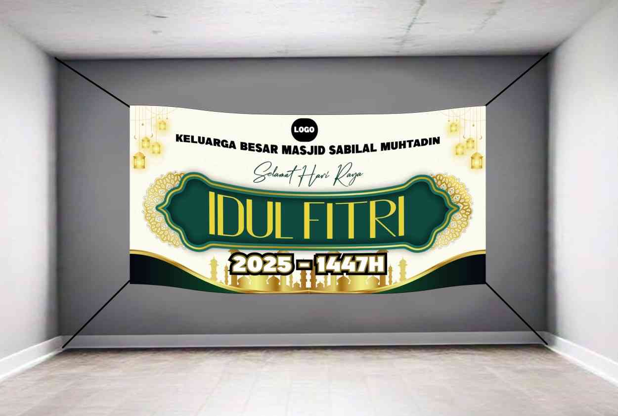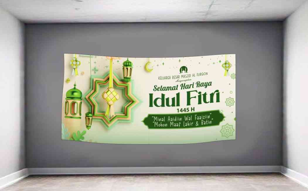 Baliho ini tampil anggun dengan dominasi warna putih dan emas yang memberikan kesan bersih, elegan, dan penuh kedamaian. Hiasan berupa lentera-lentera...