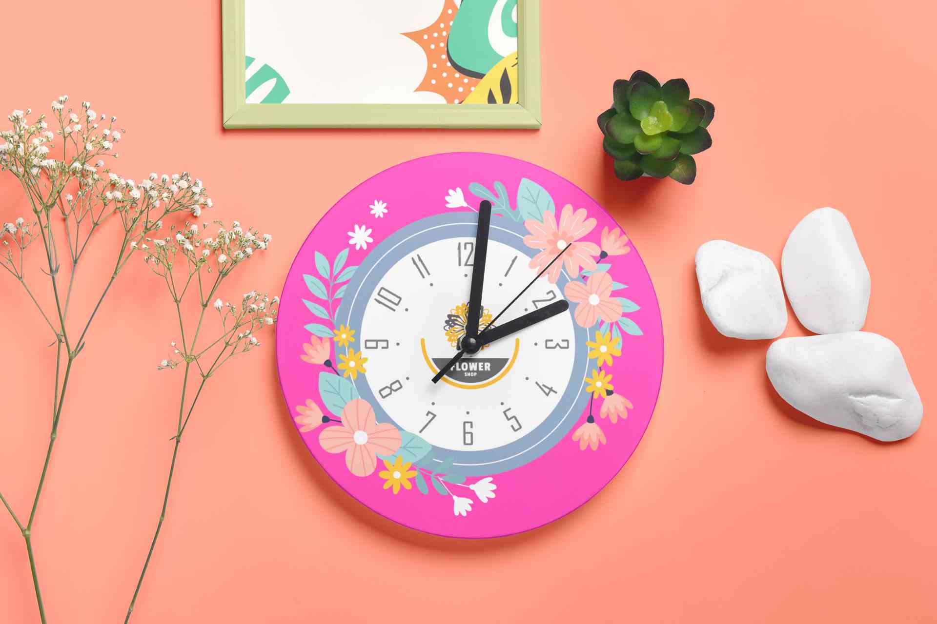 Desain jam ini mengusung konsep "Floral Aesthetic" dengan nuansa feminin dan elegan. Latar belakang berwarna pink cerah memberikan kesan ceria dan men...