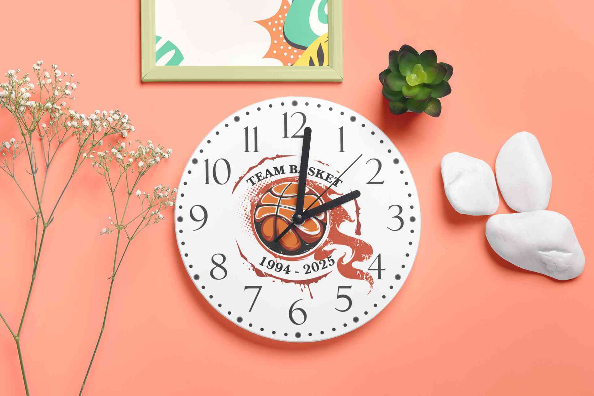 Desain jam ini mengusung konsep sporty dan dinamis, dengan tema utama basketball yang ditampilkan melalui ilustrasi bola basket di bagian tengah. Lata...