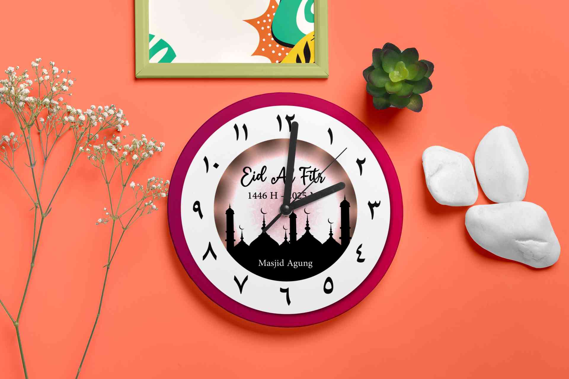 Jam ini mengusung desain Islami dengan tema Idul Fitri, menggunakan angka Arab klasik yang memperkuat identitas budaya Islam. Latar belakang memiliki...