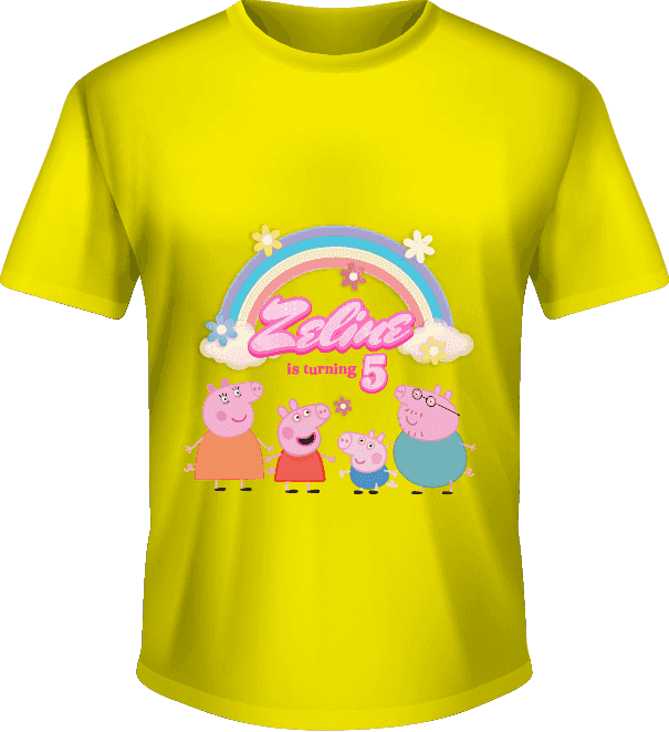 Kaos ulang tahun ini memadukan warna kuning cerah dengan ilustrasi keluarga Peppa Pig yang penuh kehangatan. Di atas karakter Peppa, George, Mummy Pig...