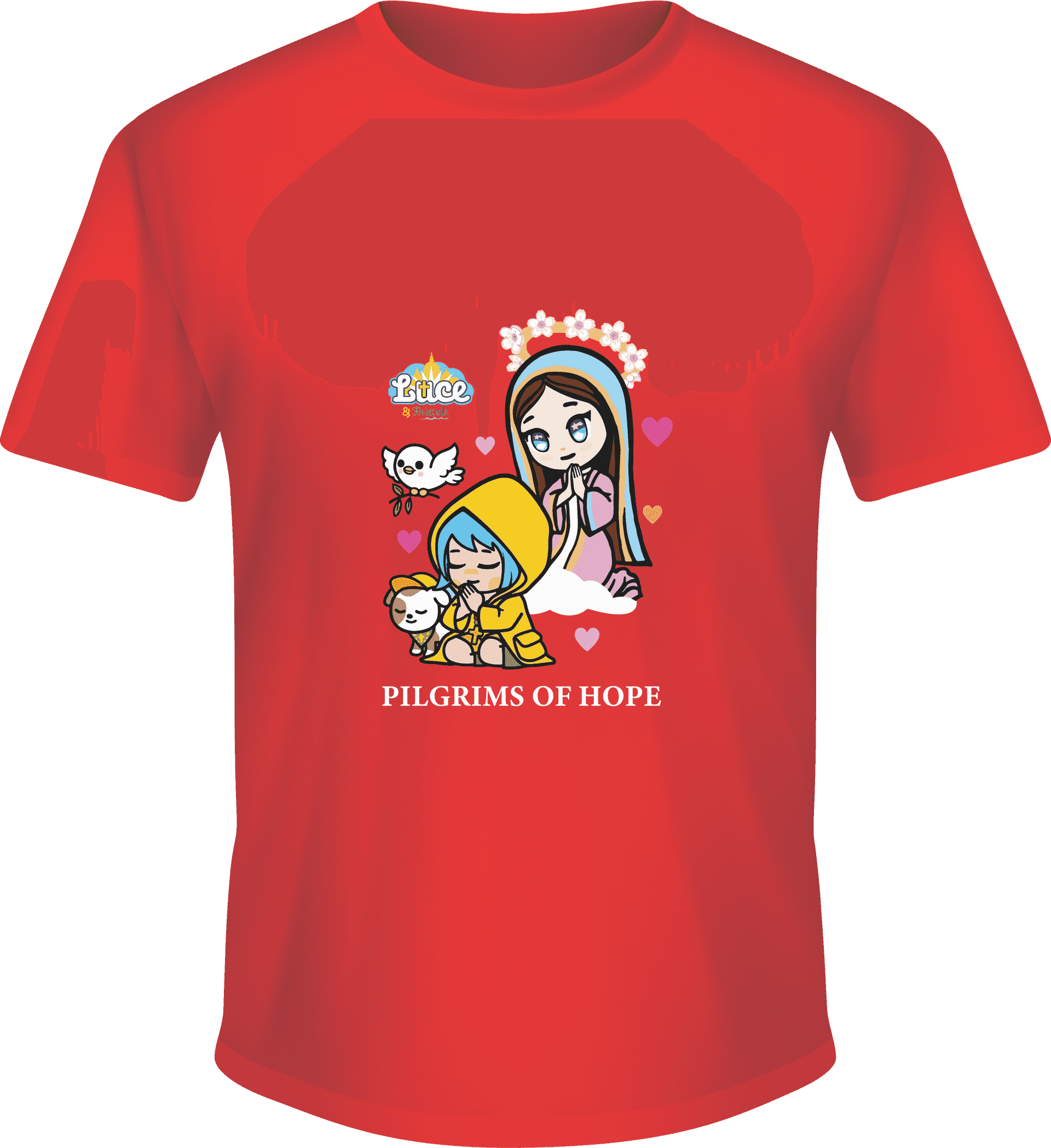 Desain ini menampilkan ilustrasi karakter anak-anak dalam gaya kartun yang menggemaskan, masing-masing mengenakan pakaian berwarna cerah seperti hijau, merah, biru, dan kuning dengan hoodie lucu serta membawa tongkat pendaki, merepresentasikan tema "Pilgrims of Hope". Di bagian tengah terdapat simbol hati merah yang memperkuat pesan kasih dan persahabatan. Logo "Luce & Friends" ditampilkan di bagian bawah, memperkuat identitas karakter. Warna putih pada kaos menjadi latar yang bersih dan menonjolkan ilustrasi secara visual, cocok untuk dipakai dalam acara komunitas rohani, kegiatan anak-anak, atau event keluarga bertema harapan dan kebersamaan.