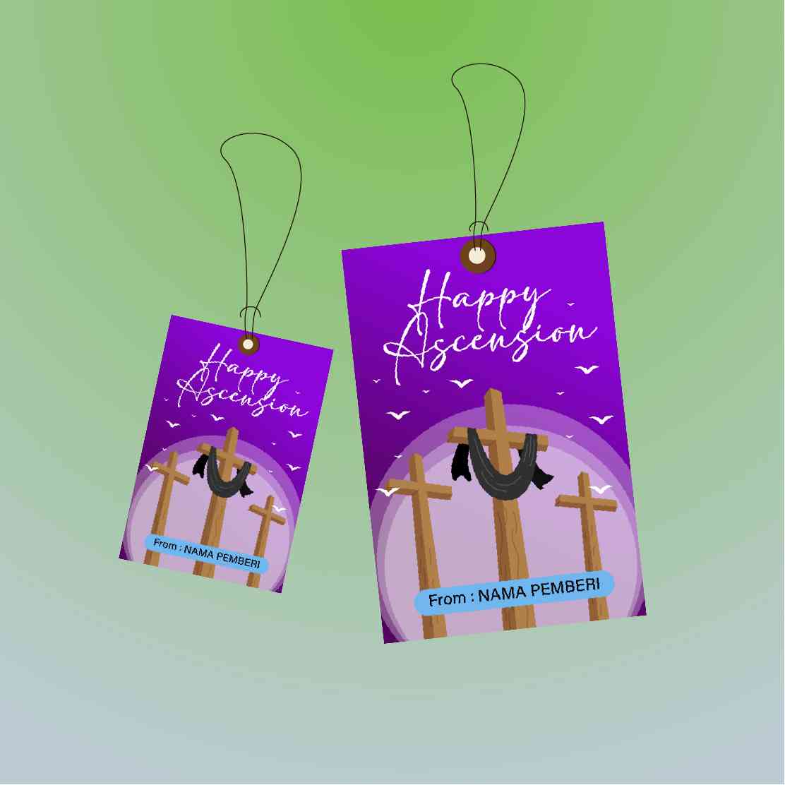 Hangtag dengan latar awan dan salib dominan ini menggambarkan kenaikan ke surga dalam nuansa cerah dan penuh harapan. Ideal untuk acara ibadah atau ha...