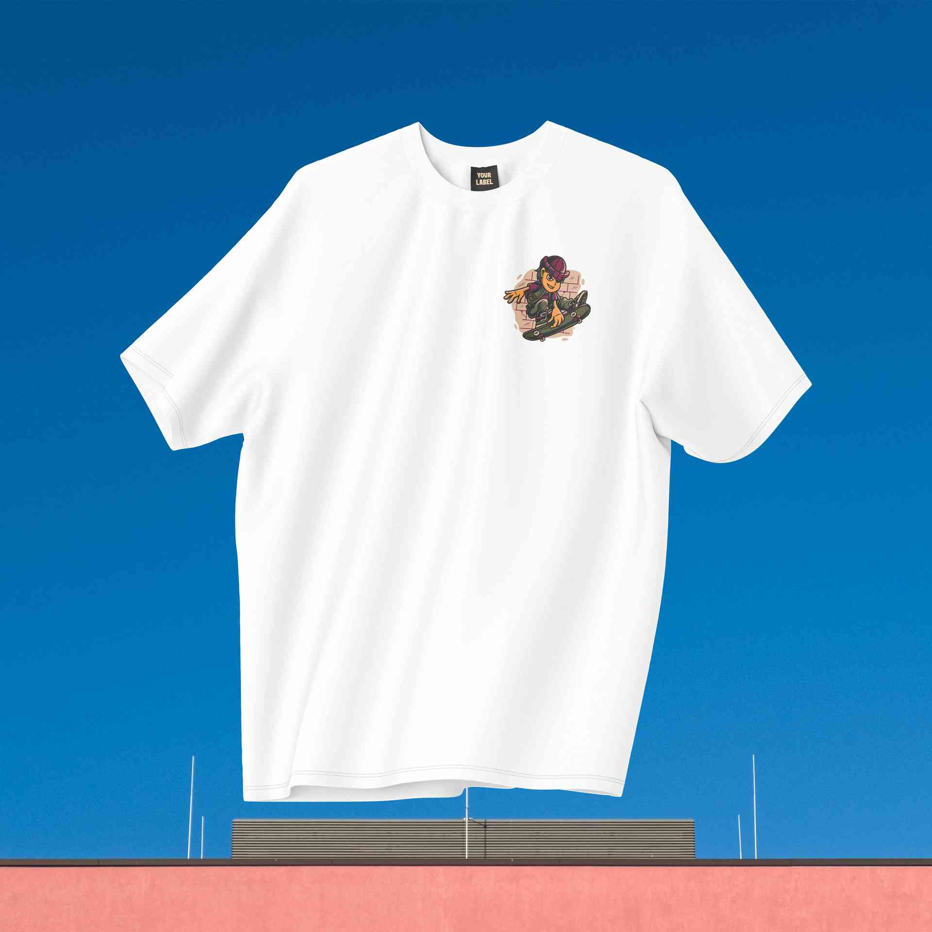 Kaos ini menampilkan karakter maskot lucu bergaya streetwear yang sedang meluncur penuh semangat! Di bagian belakang terdapat ilustrasi besar bertema...