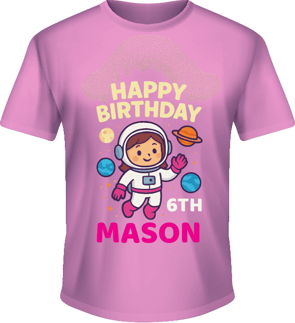 Kaos ini menghadirkan ilustrasi ceria seorang anak kecil dalam kostum astronot yang melayang di luar angkasa, dikelilingi oleh planet-planet dan binta...