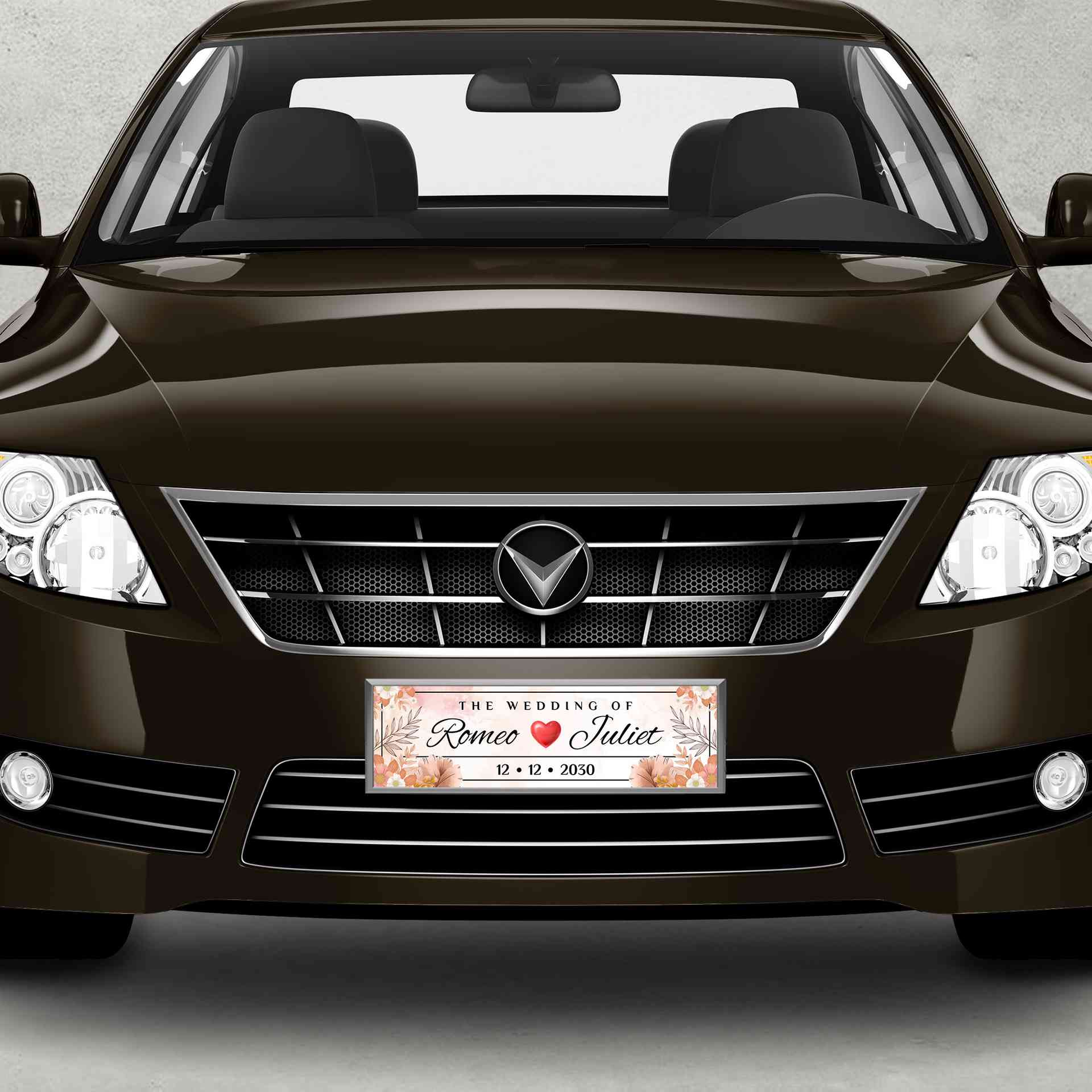 Wedding plat di atas menampilkan desain romantis dan elegan dengan tulisan dalam kombinasi huruf kapital dan kaligrafi yang anggun. Simbol hati merah...