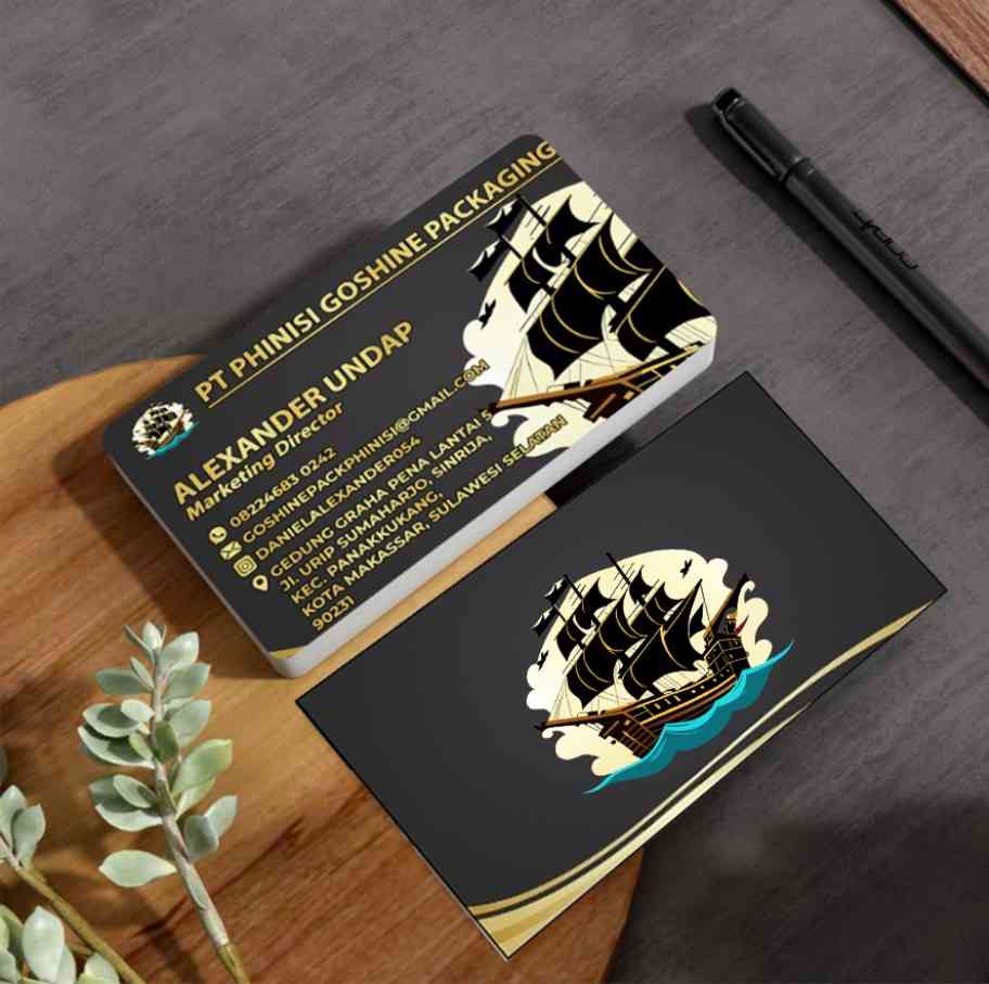 Kartu nama ini memiliki desain unik dan berkarakter dengan tema kapal phinisi yang mencerminkan identitas perusahaan PT Phinisi Goshine Packaging. War...