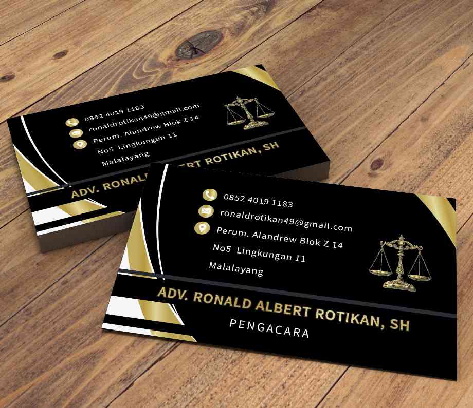 Kartu nama ini dirancang dengan nuansa profesional dan eksklusif, memadukan latar belakang hitam pekat dengan aksen lengkungan emas mengilap yang melengkung halus di bagian atas dan bawah. Warna emas melambangkan kemewahan, otoritas, dan kepercayaan, sangat cocok untuk profesi bergengsi seperti advokat, pengacara, notaris, atau konsultan hukum. Di sisi kiri, terdapat ikon telepon, email, dan lokasi dengan efek lingkaran emas yang menyatu harmonis dengan tema keseluruhan. Area tengah disediakan untuk menampilkan nama, gelar, dan jabatan secara mencolok, serta kontak penting dengan keterbacaan tinggi. Desain ini tidak hanya menarik perhatian, tetapi juga memberikan kesan kuat, terpercaya, dan elegan kepada siapa pun yang menerimanya. Ideal untuk digunakan dalam dunia profesional yang mengutamakan kesan pertama yang berkelas.