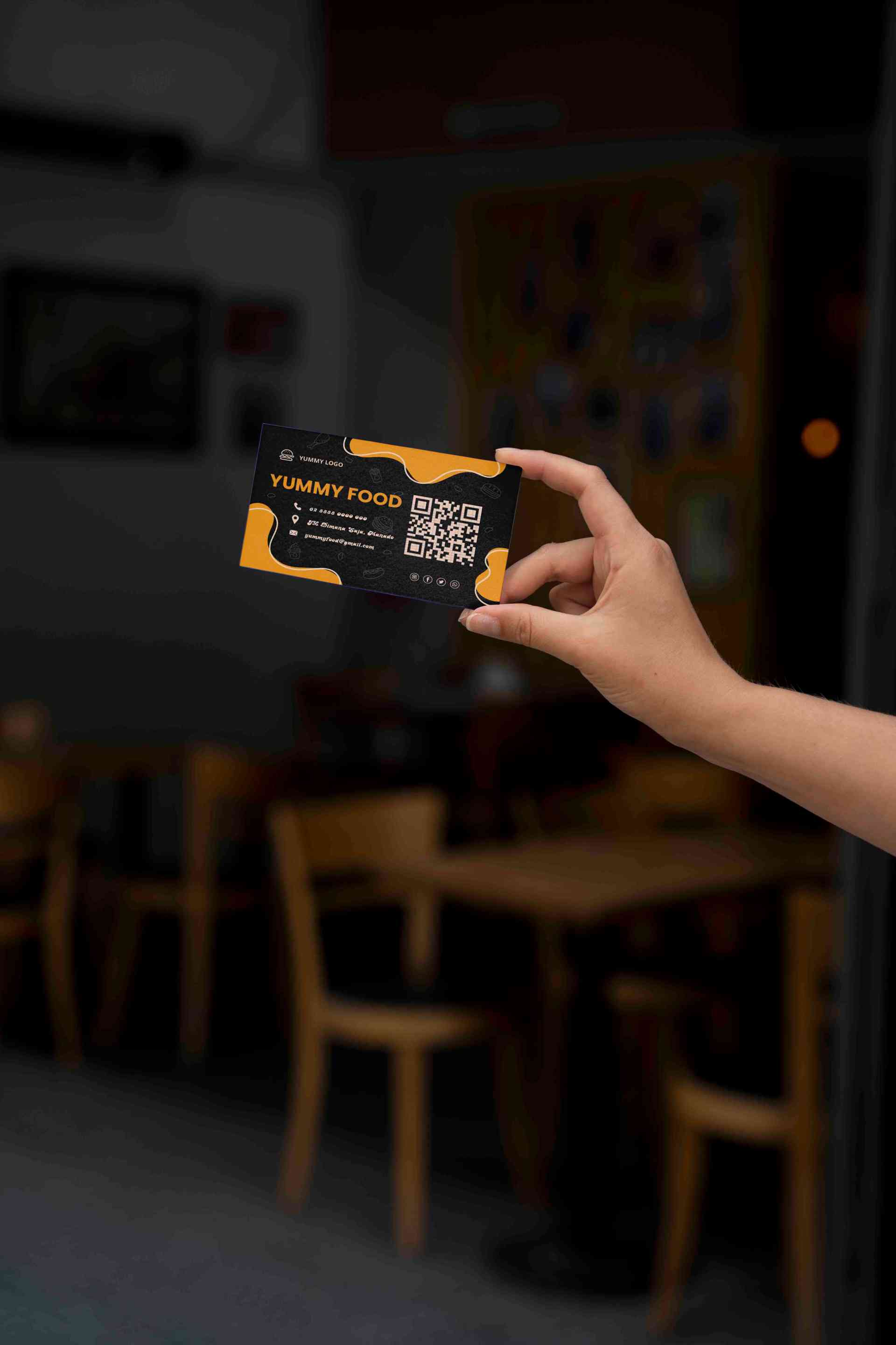 Kartu nama bertema Yummy Food ini didominasi warna hitam dengan aksen kuning cerah pada bagian tepi, memberikan kesan modern dan dinamis yang menonjol...