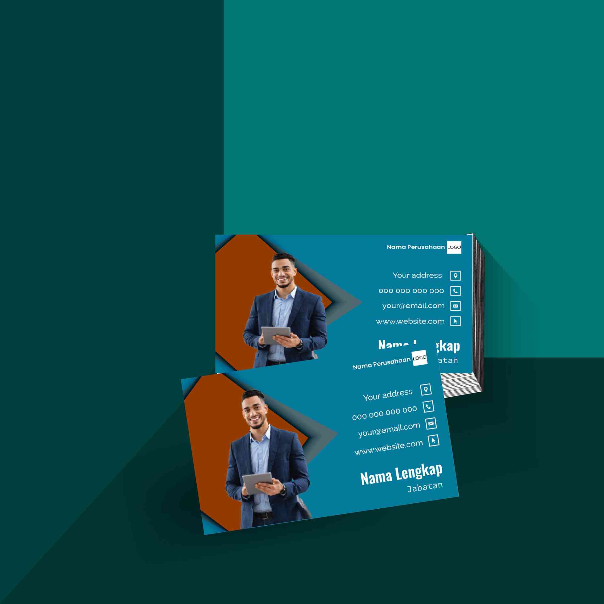 Kartu nama profesional berbentuk persegi panjang dengan dominasi warna biru tosca dan aksen geometris oranye yang tegas, menampilkan karakter pria ber...